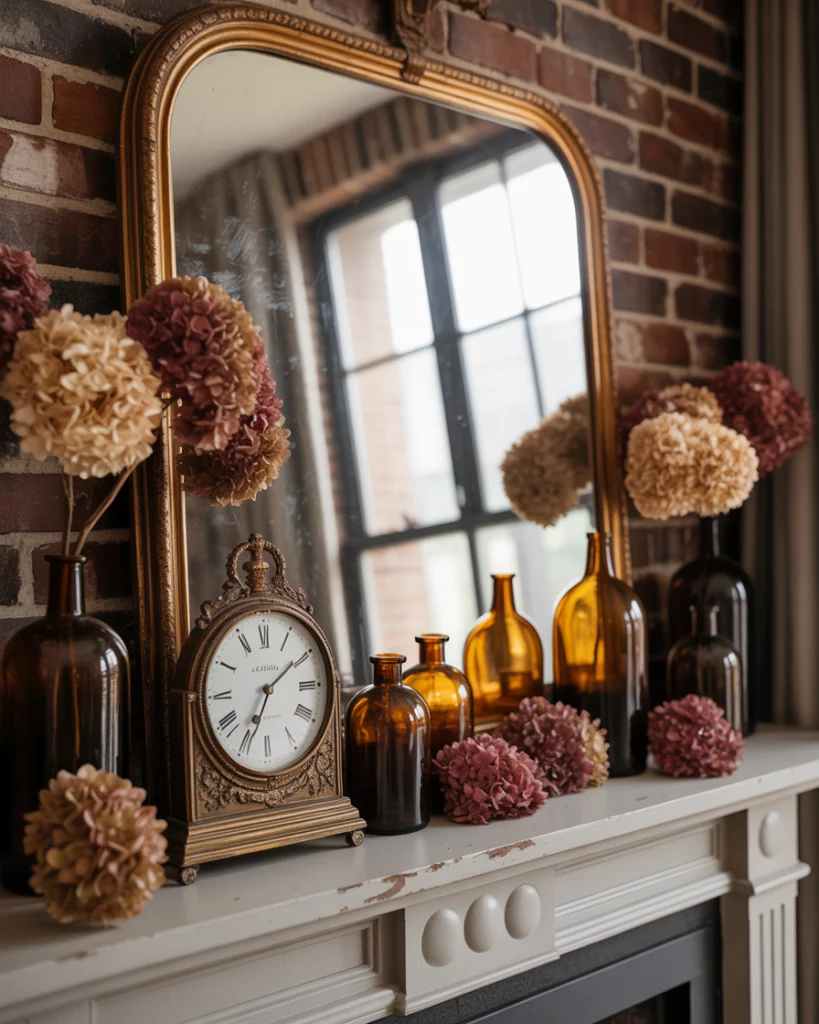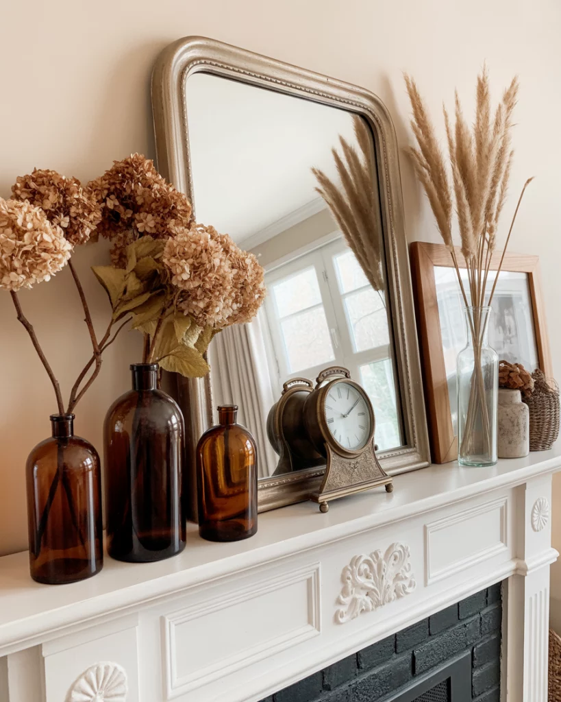 A vintage fall mantle centered around a fireplace mirror adds layers of character. Think aged wood frames, dried hydrangeas, and warm amber bottles. Placing an antique with clock nearby ties the look together. This style works especially well over older mantles or restored farmhouse fireplaces. Friends often comment on how it feels like stepping into another era, cozy and rich with history.