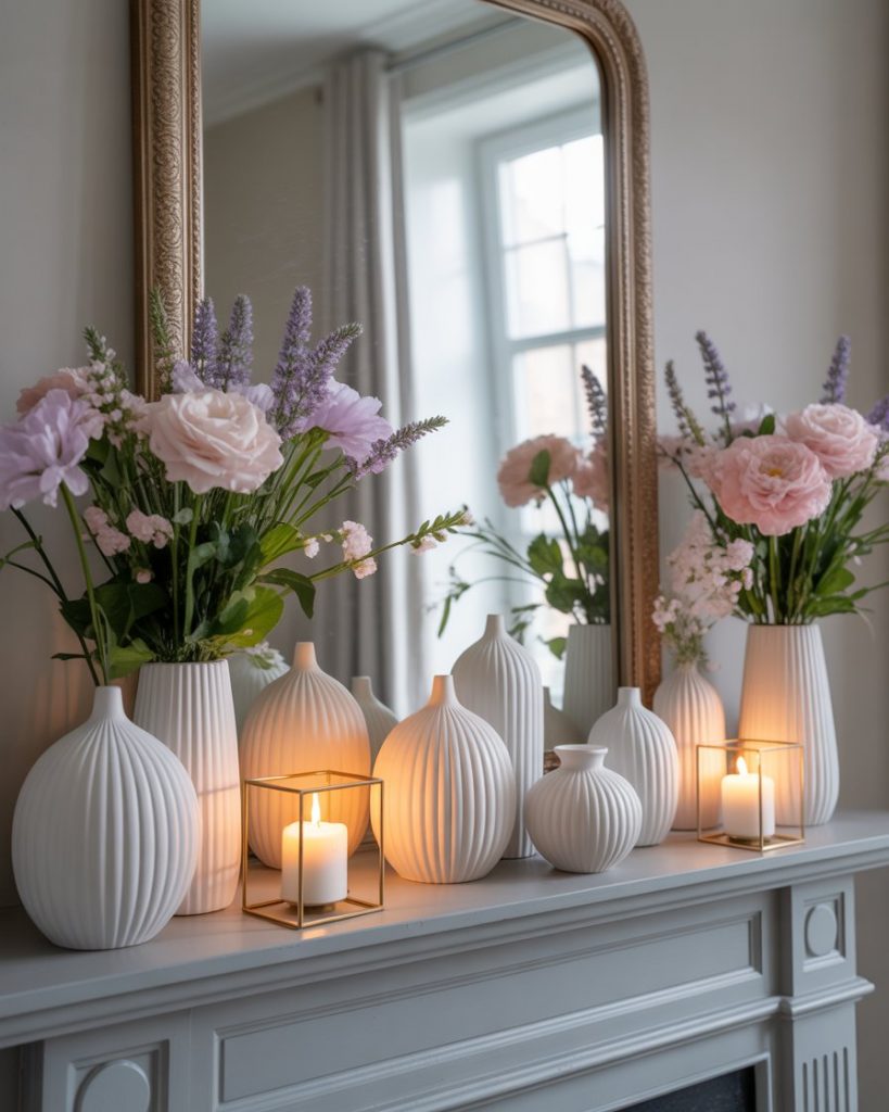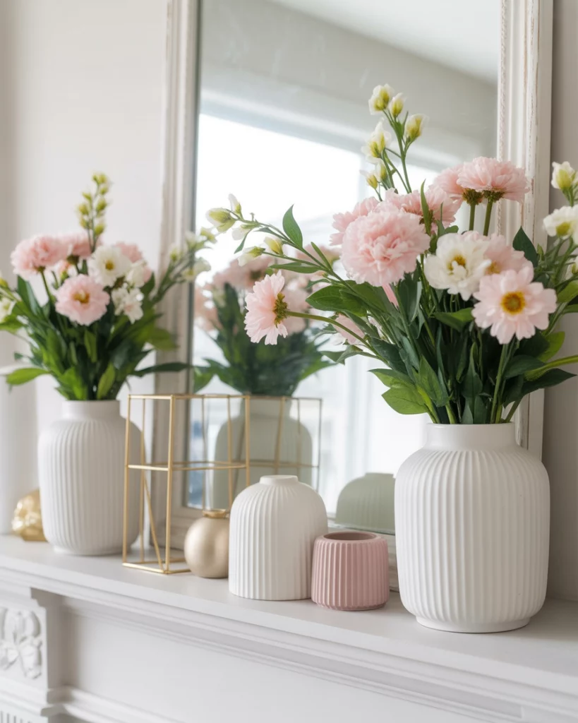 A contemporary mantle in spring embraces fresh, uncluttered energy. Imagine sleek white vases filled with pastel blooms, geometric candleholders, and a clean with mirror look above. Pops of green and soft pink keep it seasonal but not overwhelming. I once styled a mantle like this in April, and the freshness was contagious—it felt like an instant mood boost for everyone in the room. Perfect for open-plan modern spaces.