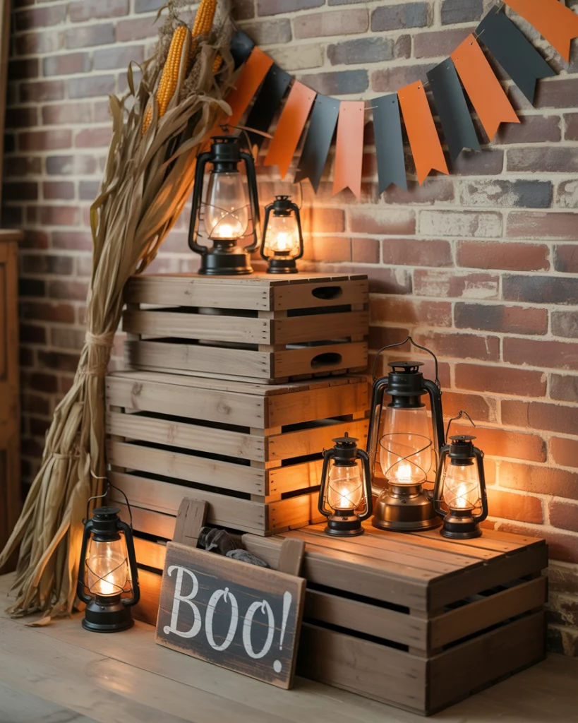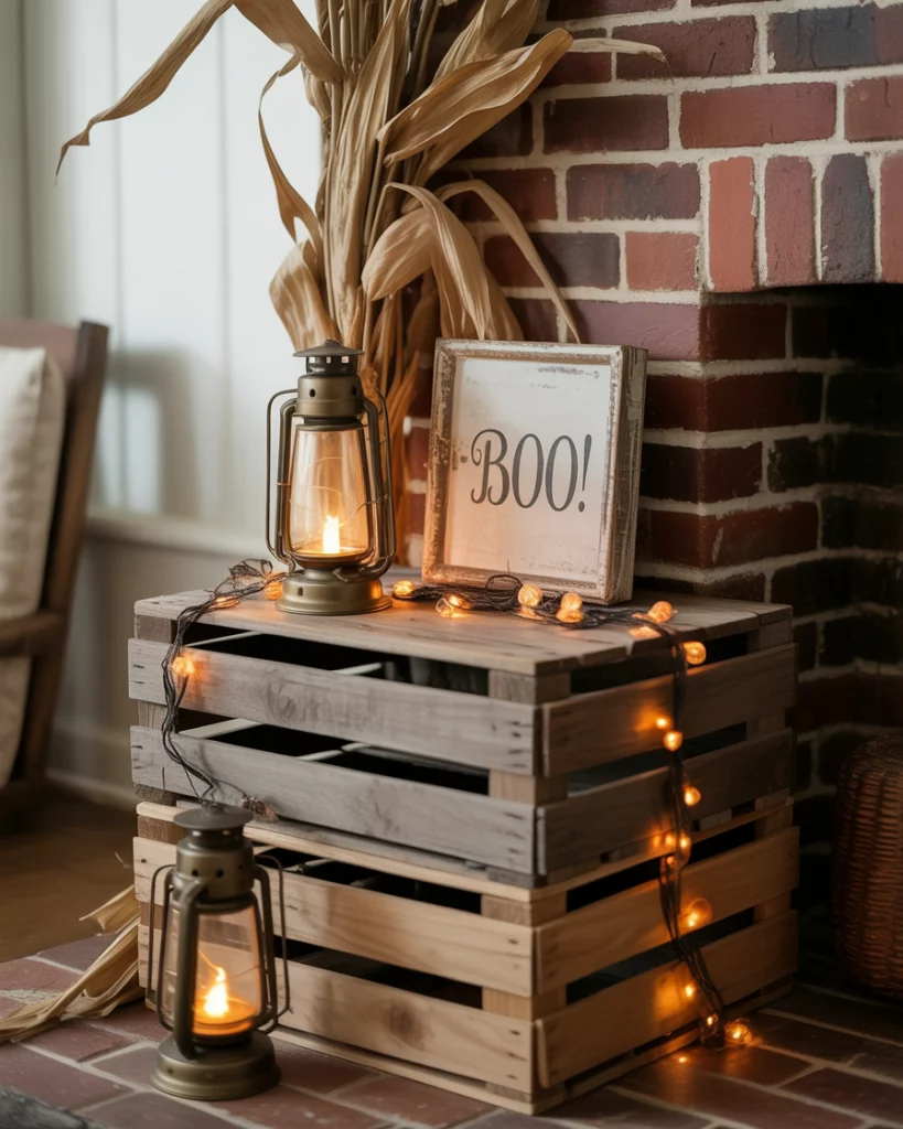 If you like spooky but subtle, go for a Halloween mantle with a rustic spin. Think wooden crates, vintage lanterns, black-and-orange bunting, and dried cornstalks arranged over the fireplace. Adding plaid blankets or warm tones connects this style back to fall gatherings, making it more versatile. I saw this approach at a farmhouse party—it blended fun with warmth, never tipping into over-the-top decorations.
