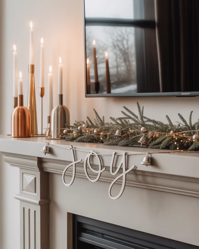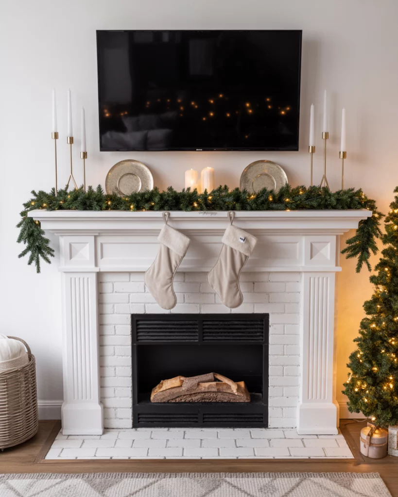 The modern christmas look brings sleek, clean lines to your mantle. Think minimalist garlands, metallic candleholders, and bold symmetry. A neutral christmas palette of whites and silvers paired with black accents creates sophistication without being cold. This style works especially well with tv above, since it avoids clutter. If you want a splash of festivity, add one or two colorful christmas ornaments for contrast. It’s a smart choice for those who love contemporary design and a polished look.