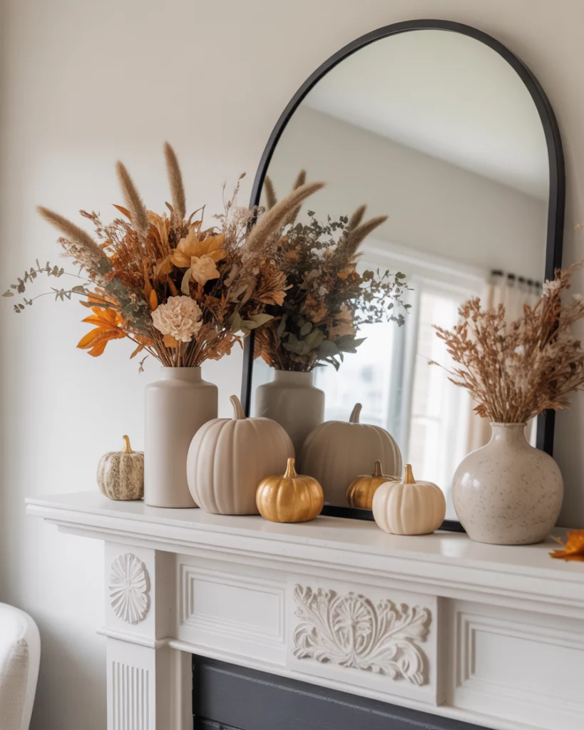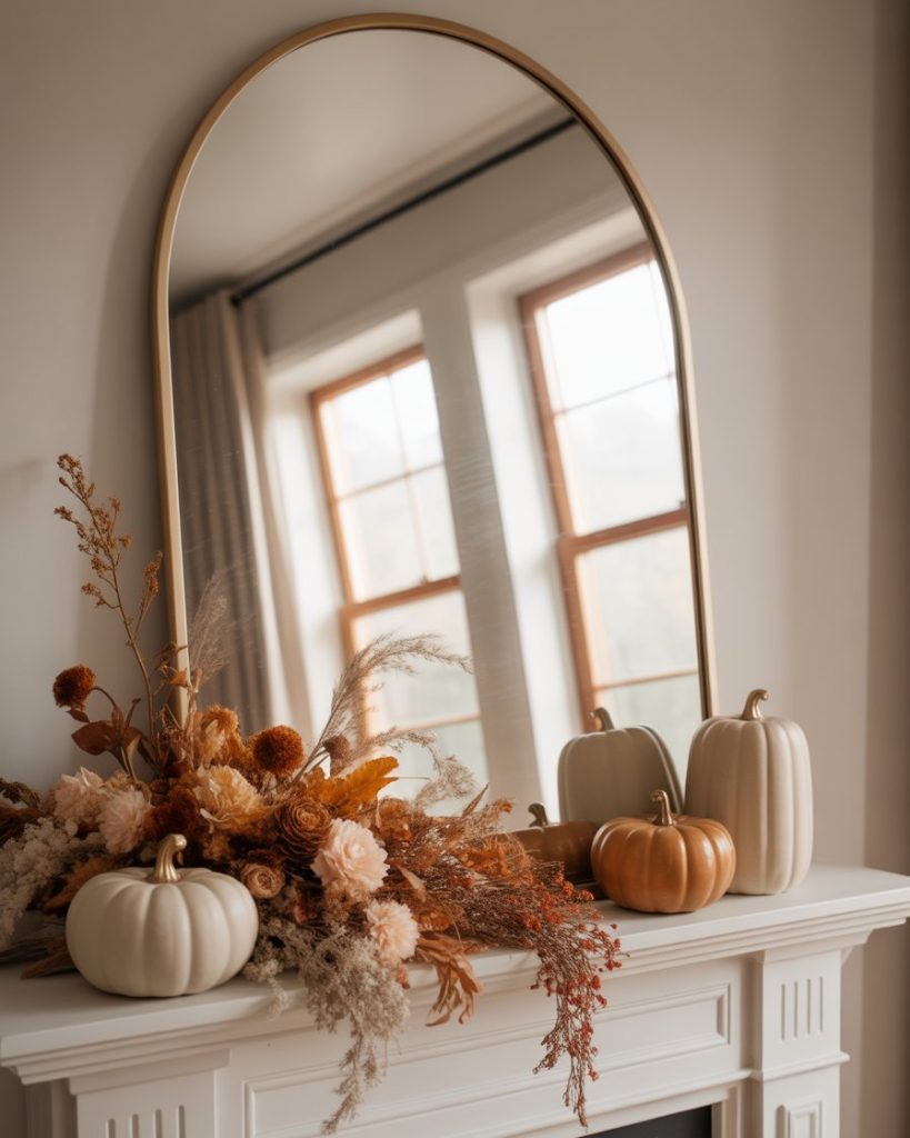 A mantle during autumn deserves a moment of its own. The modern fall trend in 2026 leans toward muted oranges, dried florals, and sleek pottery. Instead of overwhelming the mantle, keep it balanced with asymmetrical designs and subtle tones. Pairing this style with mirror enhances depth, while adding pumpkins in ceramic or wood avoids kitsch. I’ve seen friends refresh their mantle just for fall, enjoying the transition into cooler weather with rich yet refined touches.