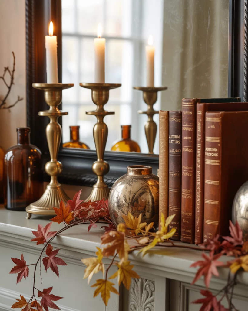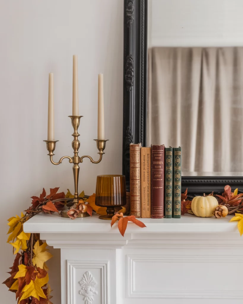 For lovers of timeless charm, a vintage fall mantle brings nostalgic warmth. Think brass candlesticks, faded books, amber glass, and cozy throws tucked nearby. This works beautifully in corner mantles or smaller living rooms, where the atmosphere feels more intimate. The trick is layering—placing old clocks or photographs over the mantle alongside fall foliage. It feels like stepping back in time, while still feeling welcoming to guests during everyday simple gatherings.