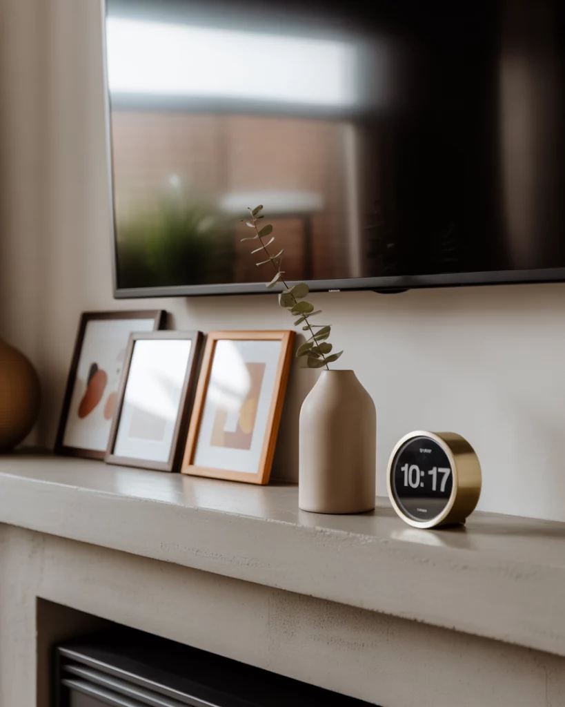 Not every mantle has to shout “holiday.” An everyday simple approach focuses on clean design, practical decor, and adaptable accents. A few framed prints, a neutral vase, and a with clock feature keep the look timeless. This style is perfect with tv above since it doesn’t compete visually. I personally love how a minimal mantle creates calm, especially after busy seasons like Christmas or Halloween. It’s a blank slate that still feels homey year-round.