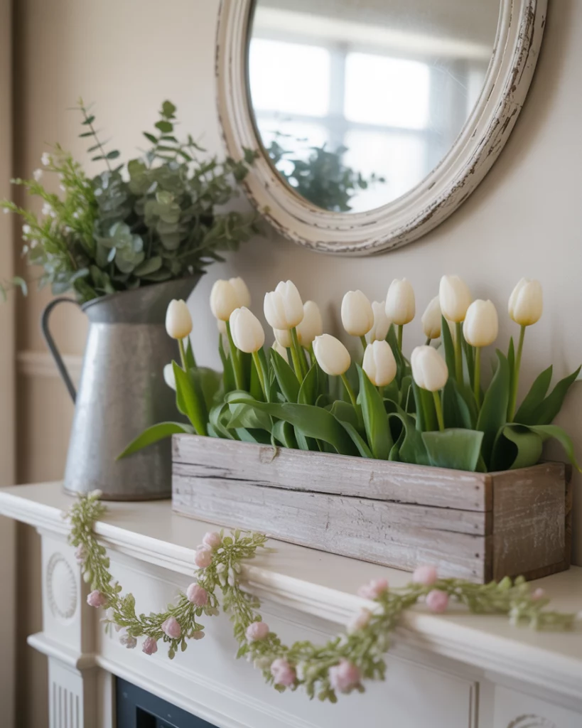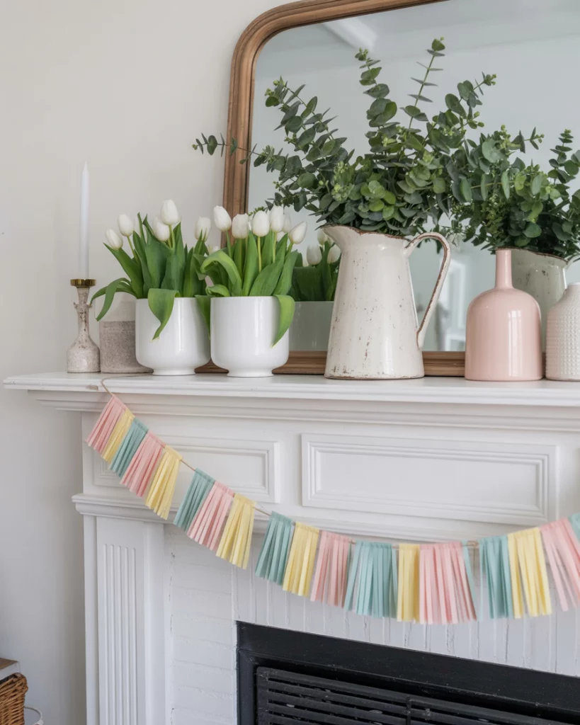 After a long winter, spring is the season to let your mantle breathe. Bring in white tulips, pastel garlands, and airy accents that reflect new beginnings. This idea is about lightness—perfect with mirror above the mantle, doubling the effect of fresh blooms. Add in a small farmhouse pitcher with greenery or bird figurines for personality. Families I’ve visited love how this mantle style transitions beautifully into Easter celebrations without requiring a complete redesign.