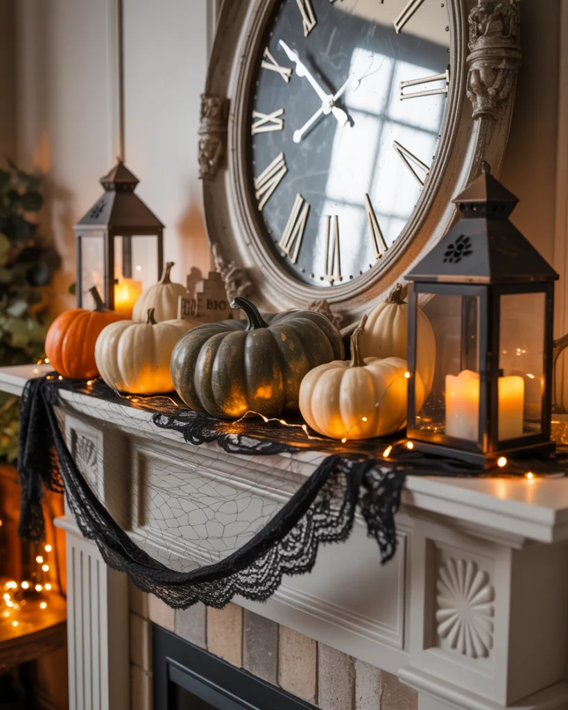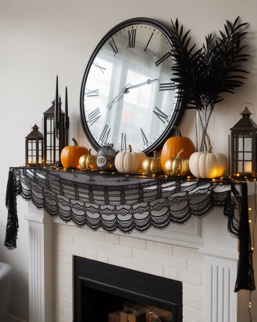 No season calls for mantle drama quite like Halloween. From black lace runners to stacked pumpkins and vintage lanterns, this style thrives on contrast. A large spooky clock with mirror adds both function and fun. Families often go for cobwebs or skeleton figurines, but I love adding subtle elegant christmas string lights to keep it cozy after trick-or-treating. This mantle can lean spooky or chic, depending on how far you want to go.