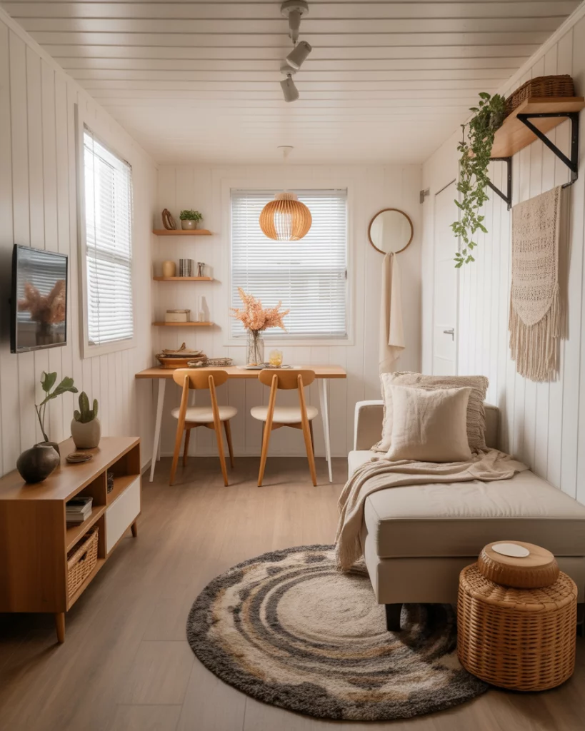 Minimalism doesn’t have to feel cold. By 2026, cozy boho touches are finding their way into minimalist spaces. Picture a neutral sofa accented with a macramé wall hanging or a stack of earthy textiles. This style blends bohemian soul with pared-down design, perfect for renters looking to personalize small tiny homes without overwhelming them. Pair natural furniture like rattan chairs with muted decor ideas—handwoven rugs, clay vases, or layered cushions—to create warmth and texture. It’s an aesthetic that feels welcoming yet uncluttered.