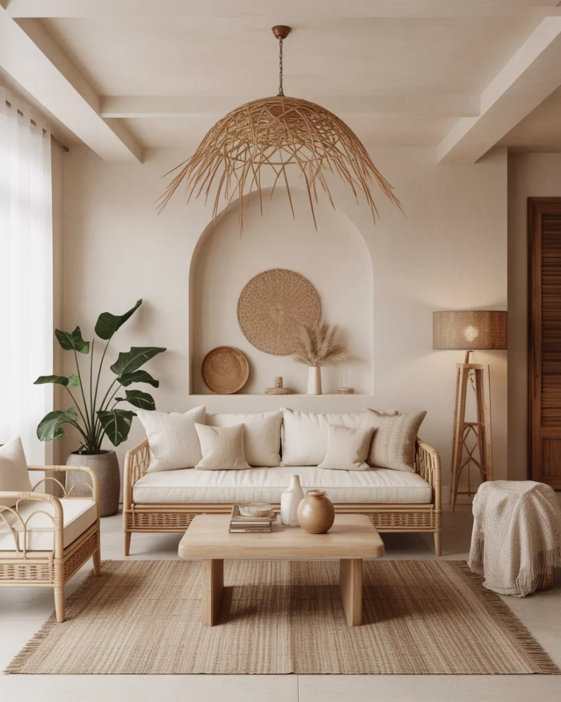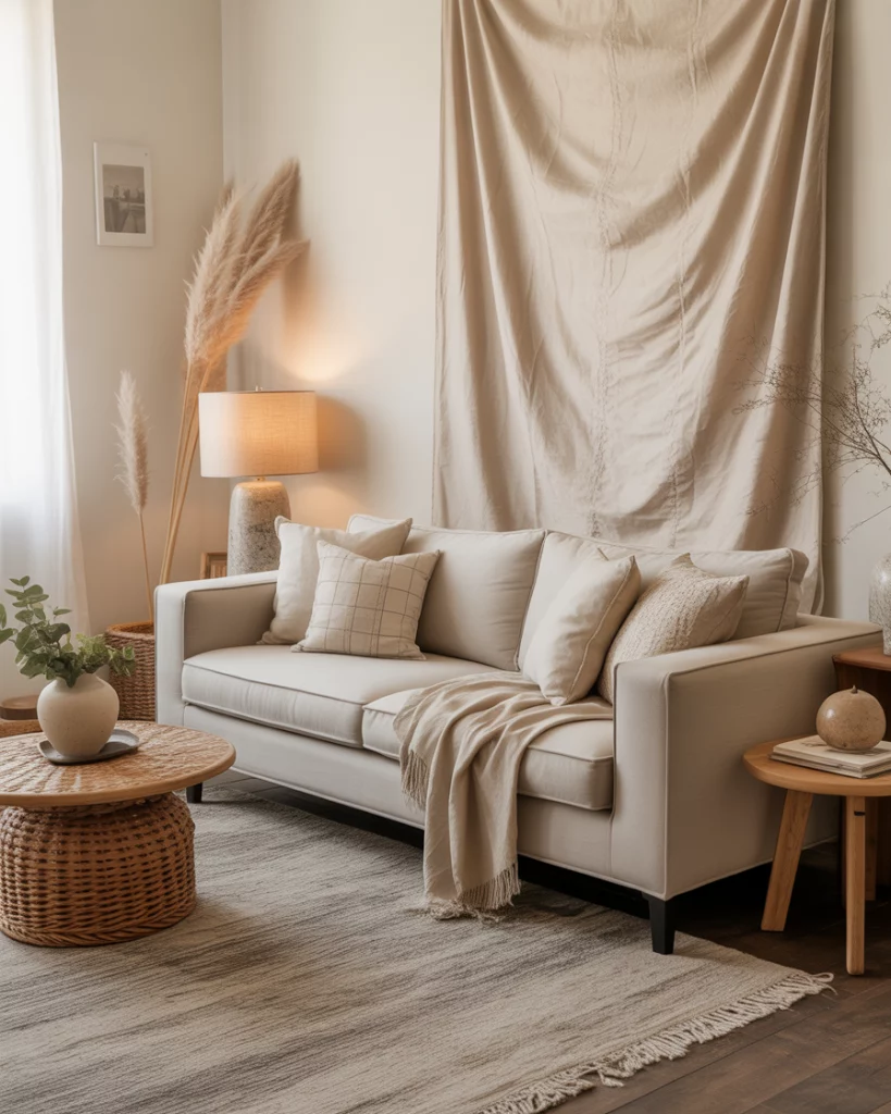 For those who crave warmth, cozy minimalism layers textures rather than objects. In 2026, linen sofas, chunky knit throws, and wool rugs transform simple spaces into welcoming havens. A modern neutral color scheme ties everything together, while a few boho accents like woven baskets or clay vases keep the look grounded. This idea shines in small tiny homes, proving that comfort doesn’t have to compromise minimalism’s clean aesthetic.