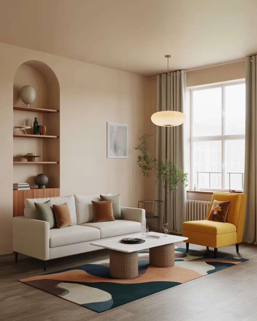 Minimalism doesn’t always mean monotone. In 2026, eclectic minimalism uses pops of color—like a mustard chair or teal rugs—against a neutral base. The furniture arrangement ideas stay simple, but bold accents add personality. This is an excellent choice for apartments where residents want both style and restraint. The key is balance: too many accents break minimalism, but just one or two bring life to the space without visual noise.