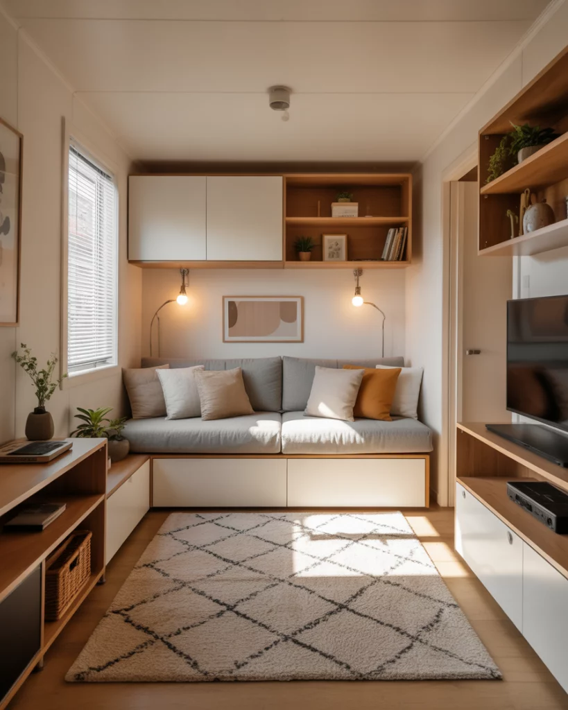 Minimalism thrives in small tiny homes, especially when paired with clever storage. In 2026, modular furniture, floating shelves, and hidden cabinets allow you to combine style and function. Add cozy accents like soft rugs and textiles to avoid a sterile feel. Pairing the living room with dining area through foldable or multipurpose pieces creates open, adaptable layouts that fit urban lifestyles. This is minimalism at its most practical—and inspiring.