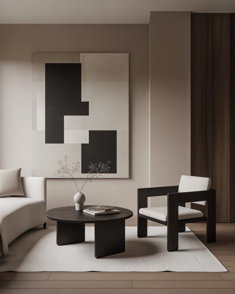 A classic contemporary minimalist idea in 2026 is black and white contrast. Sharp lines, monochrome furniture, and geometric decor ideas create a sleek, timeless appeal. This style works equally well in spacious lofts or compact apartments. Adding a textured grey rug or a single colorful art piece keeps the room from feeling too stark. This idea is perfect for those who crave bold yet uncluttered interiors.