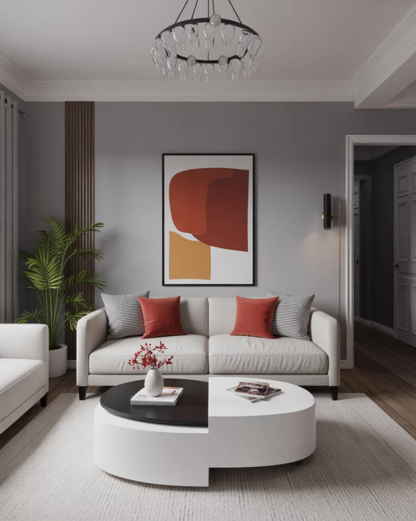In 2026, grey tones remain a favorite for minimalist living rooms because they provide both calm and versatility. Pairing light and dark greys with soft white accents creates a space that feels polished yet warm. Add textured rugs, layered cushions, and simple wood furniture arrangement ideas to keep the look cozy without breaking minimalism’s clean aesthetic. This palette works beautifully in apartments and small tiny homes, where balance and relaxation are key.