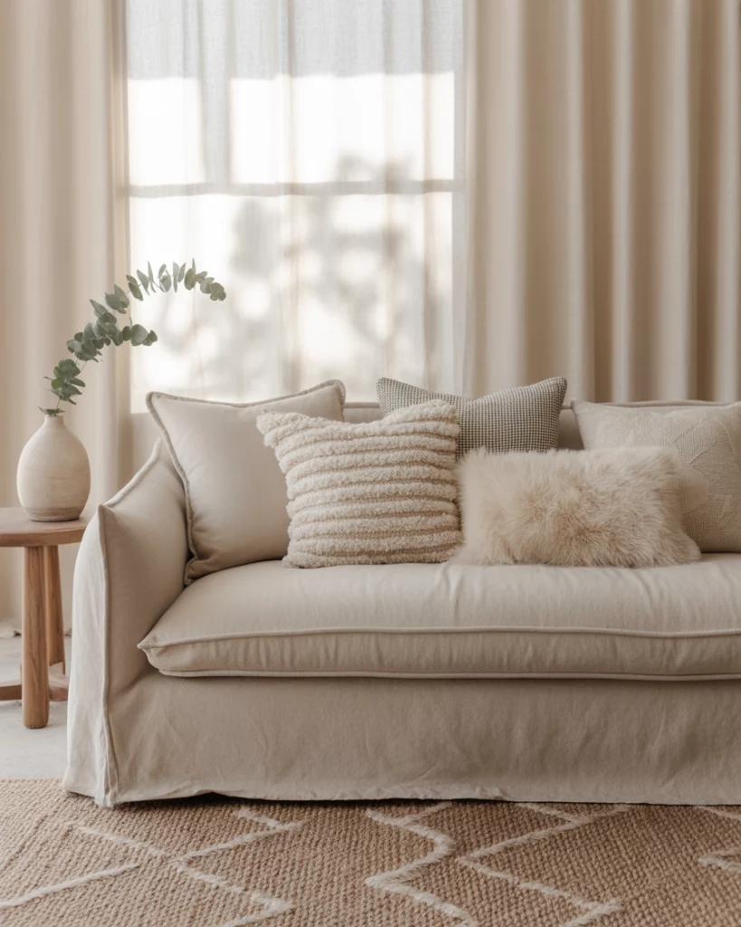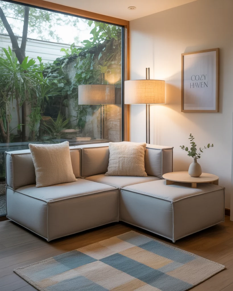 For those who crave warmth, cozy minimalism layers textures rather than objects. In 2026, linen sofas, chunky knit throws, and wool rugs transform simple spaces into welcoming havens. A modern neutral color scheme ties everything together, while a few boho accents like woven baskets or clay vases keep the look grounded. This idea shines in small tiny homes, proving that comfort doesn’t have to compromise minimalism’s clean aesthetic.