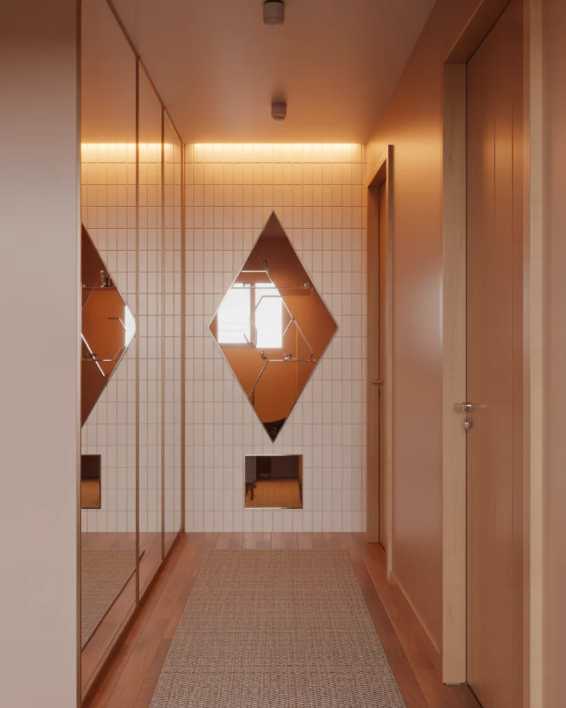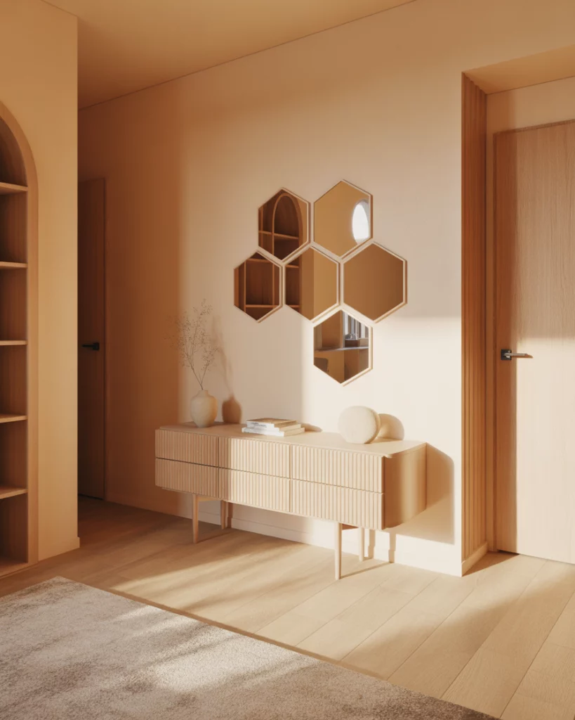 A DIY mirror wall shaped like a honeycomb adds personality to hallways and small apartments. Mixing reflective panels with a few wooden accents softens the geometry, while a touch of DIY flair makes the project uniquely yours. This look suits anyone craving a sculptural focal point that doesn’t take up floor space. Here’s where it works best: long hallways that need a moment of interest. The honeycomb pattern leads the eye forward and makes the corridor feel wider. It also turns an overlooked pass-through into a stylish destination.