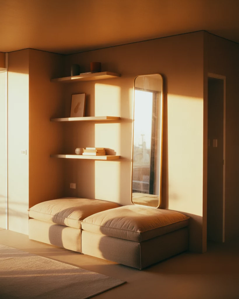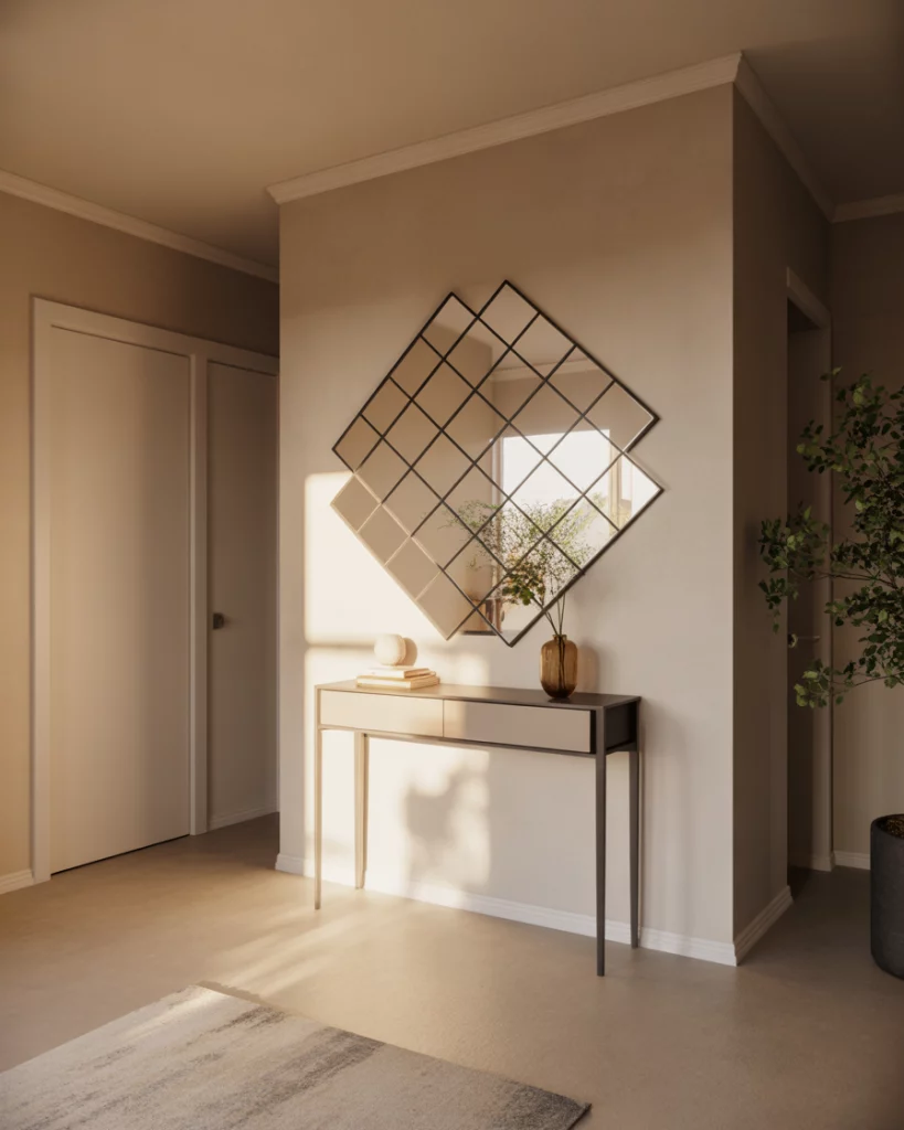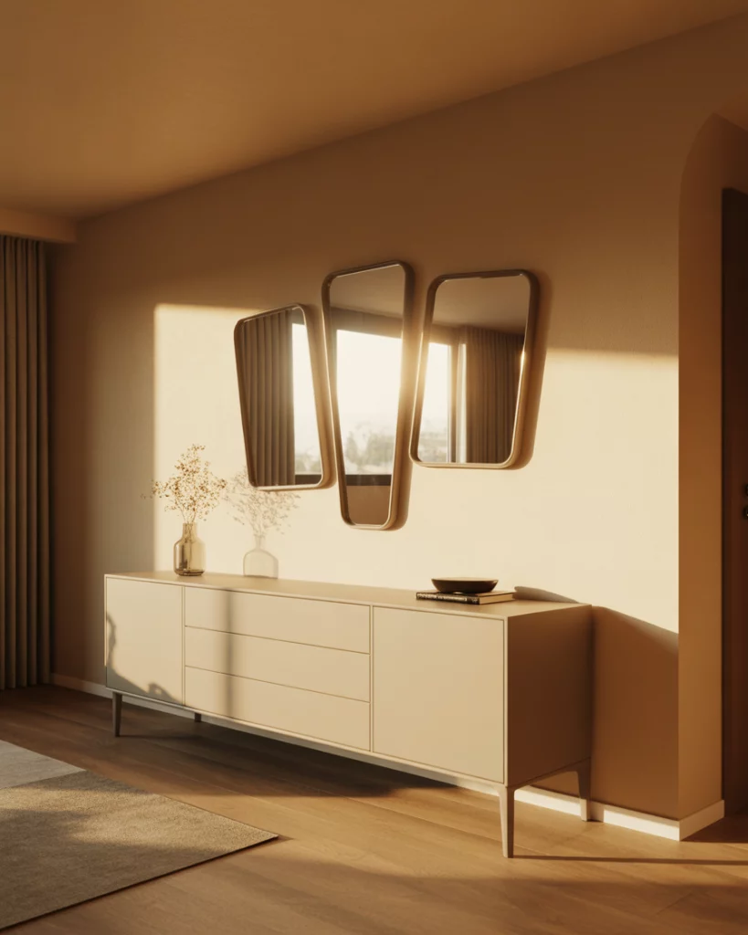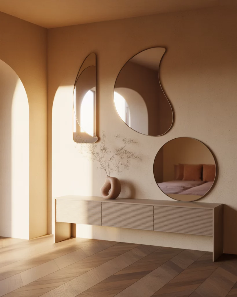 A crescent-shaped mirror set curves gracefully along walls, adding a dreamy visual arc. Its celestial feel pairs nicely with aesthetic interiors and sets a gentle mood in an entrance that benefits from softness over structure. Combining multiple crescents creates subtle motion. Many people hang crescents near accent lamps to enhance evening glow. The curved reflections make the light feel warmer and more atmospheric.