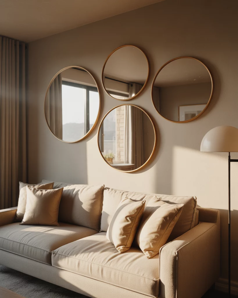 Layering mirrors of different sizes creates a sculptural look that feels gentle and modern. It works beautifully in a circle-themed gallery wall or against smooth plaster finishes that echo a living room’s modern aesthetic. The overlapping edges add motion without overwhelming the room. rooms with limited wall art but strong natural light. The gentle curves soften angular furniture and bring a serene balance to contemporary layouts.