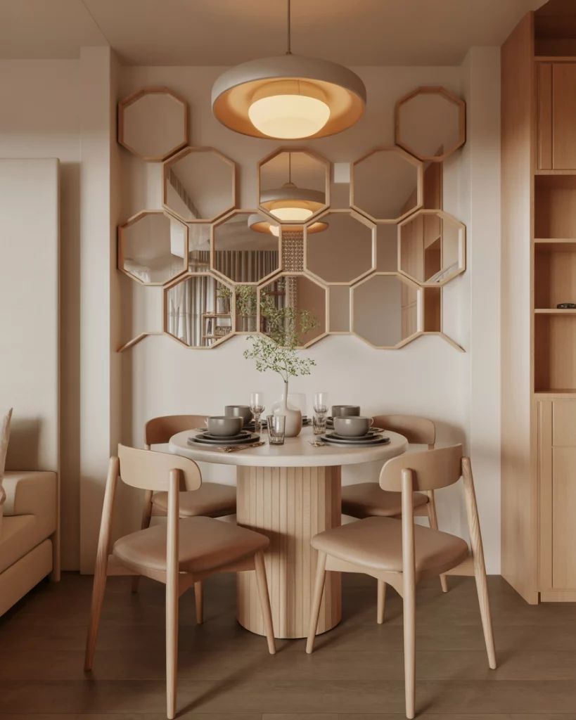 A honeycomb-style grid brings a modern yet playful dimension to compact dining nooks. Its geometric repetition works well in living room ideas for small, simple spaces where dining areas often share visual territory. The structured form feels intentional and sculptural. Many people use dining corners as part-time workspaces, and honeycomb mirrors brighten the zone while keeping the area feeling styled, not improvised.