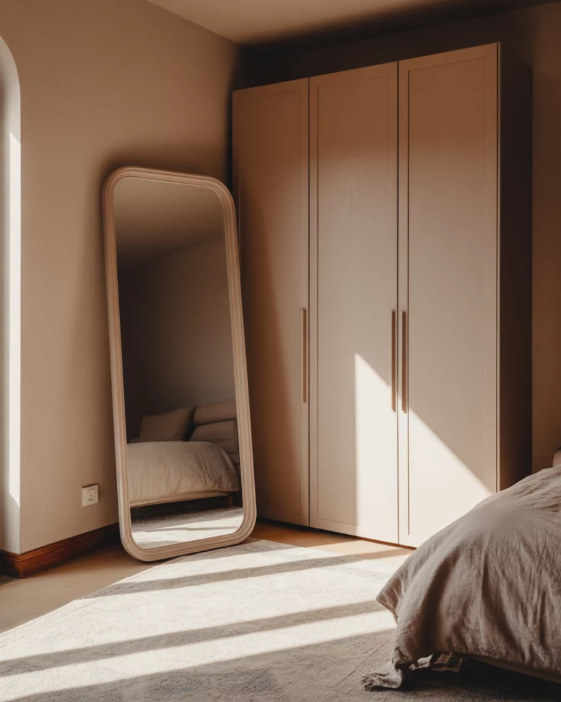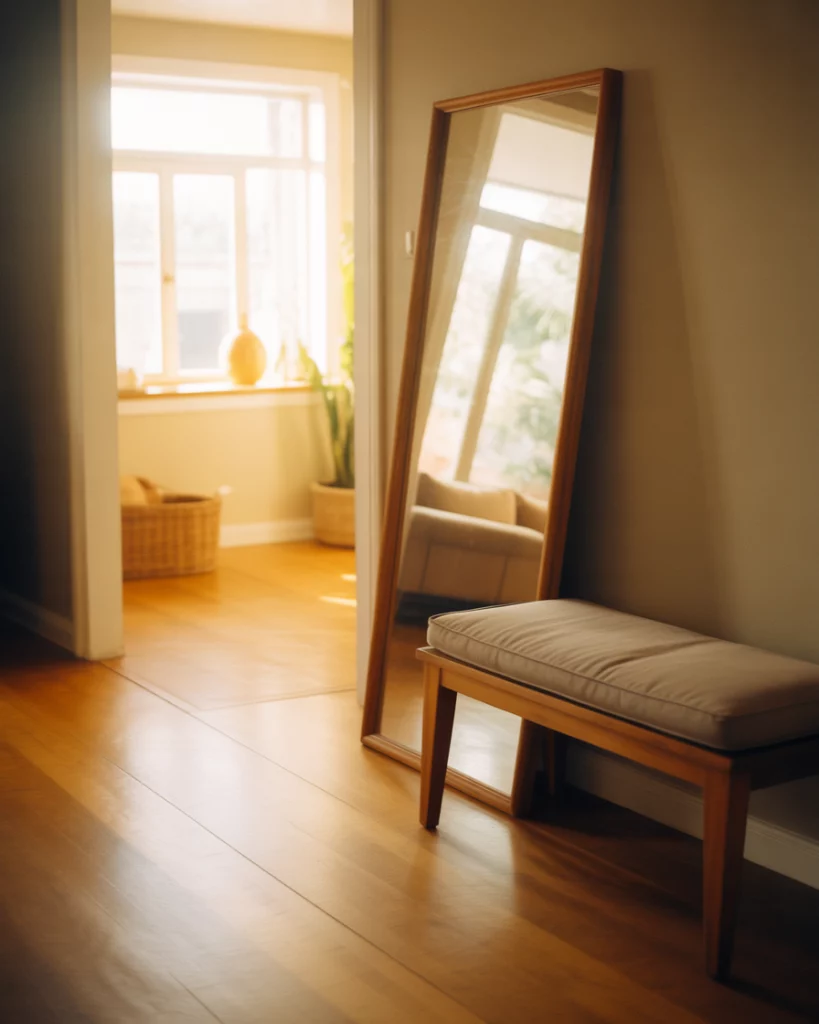 A tall vertical mirror with natural wood trim adds height and warmth to transitional areas between rooms. Its grounding effect complements wooden flooring and blends smoothly into a room aesthetic that leans earthy or Scandinavian. It’s a subtle statement piece. placing tall mirrors opposite clutter. Reflecting busy shelves or storage nooks can unintentionally amplify visual noise.