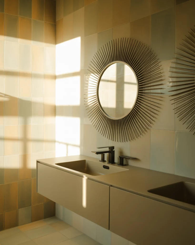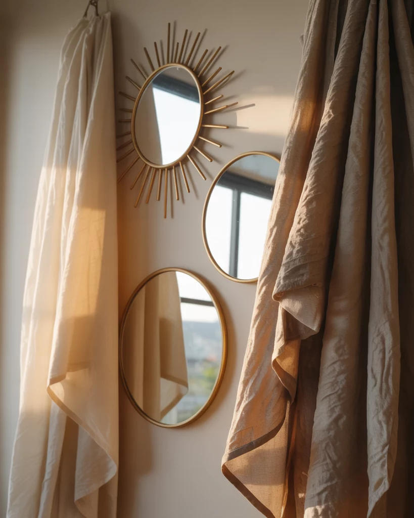 A refined sunray mirror over a vanity elevates a basic bathroom instantly. With slim metallic arms radiating from the center, it adds lightness and symbolic warmth. It’s a stylish upgrade for a washbasin living room transition or a compact bathroom needing personality. Choose moisture-resistant finishes. In bathrooms, humidity can dull metallic accents unless they’re properly sealed or inherently corrosion-resistant.