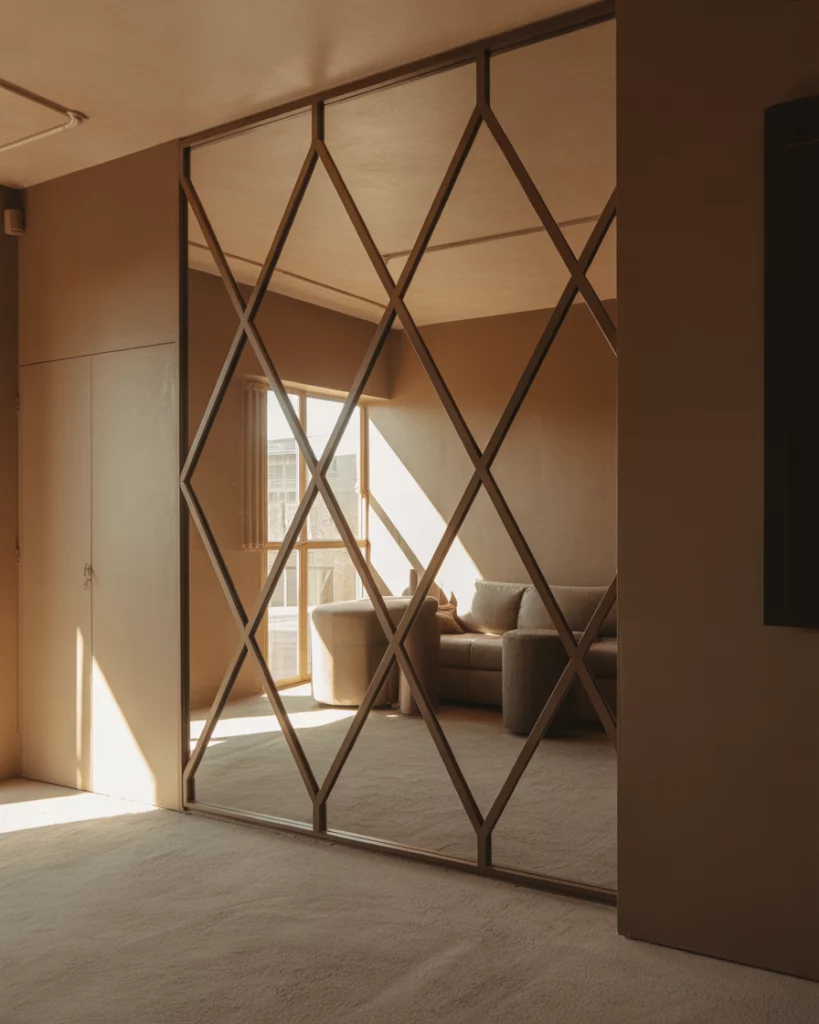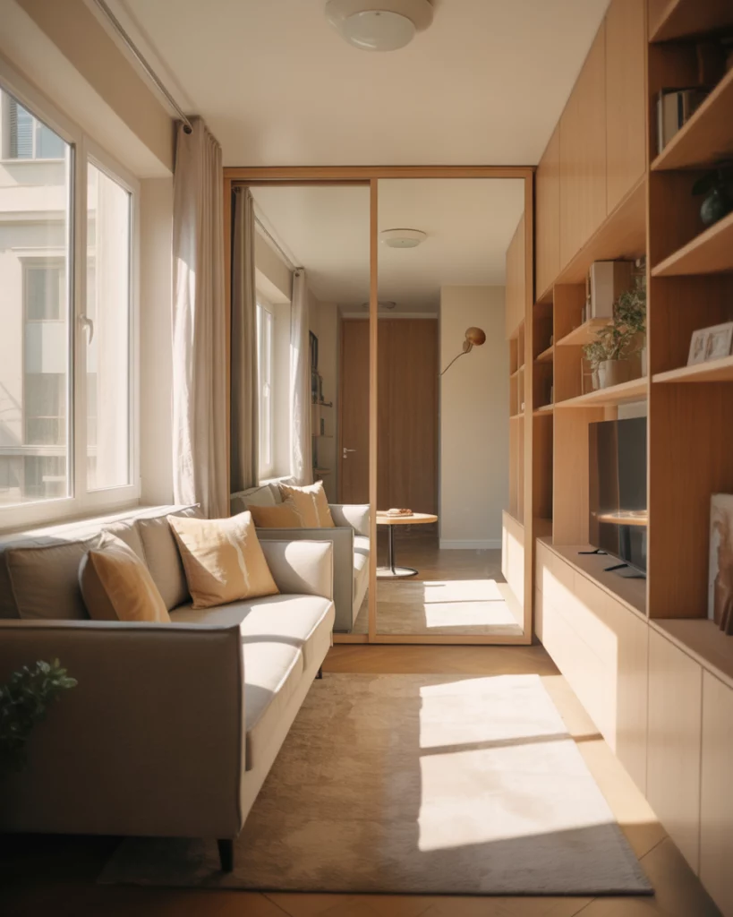 A full mirror panel visually doubles tight interiors, ideal for living room ideas in small spaces where square footage is limited. Mounted seamlessly, it creates an airy wall that feels architectural rather than decorative. The effect works especially well behind low furniture. Avoid placing full panels directly across from large windows unless you want intense brightness. Controlled light yields a more elegant glow.