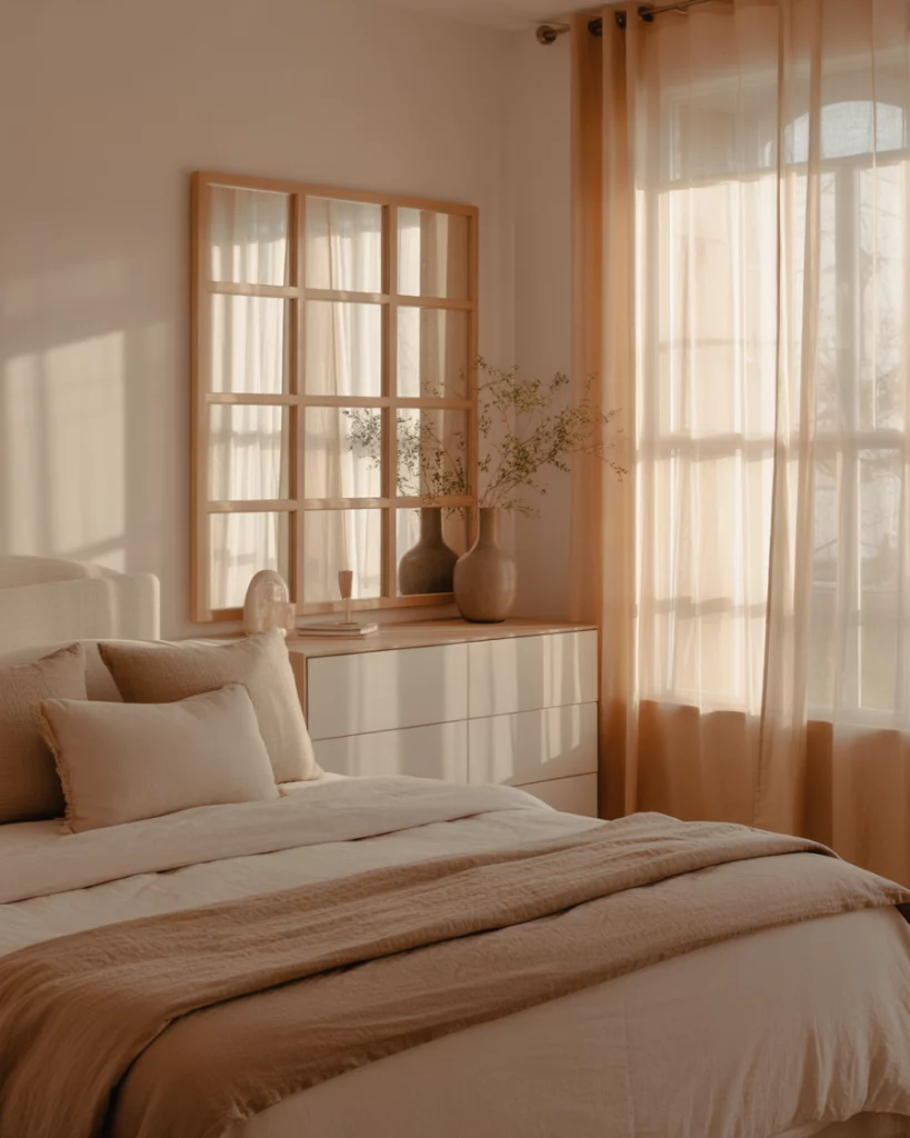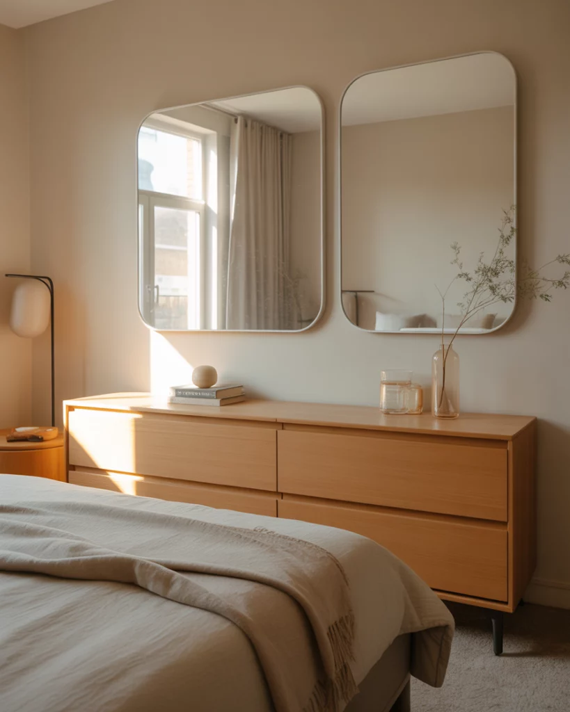 Wood-framed mirror grids bring structure without feeling strict, a great match for bedroom aesthetic ideas that lean cozy but polished. The repetition of small panes creates a window-like effect, especially in rooms craving more visual depth. Choose raw or lightly stained wooden frames for an organic touch. Budget-wise, mirror grids offer impact without requiring large custom pieces. Many American retailers sell affordable modular options, letting you scale the look to your room without overspending.