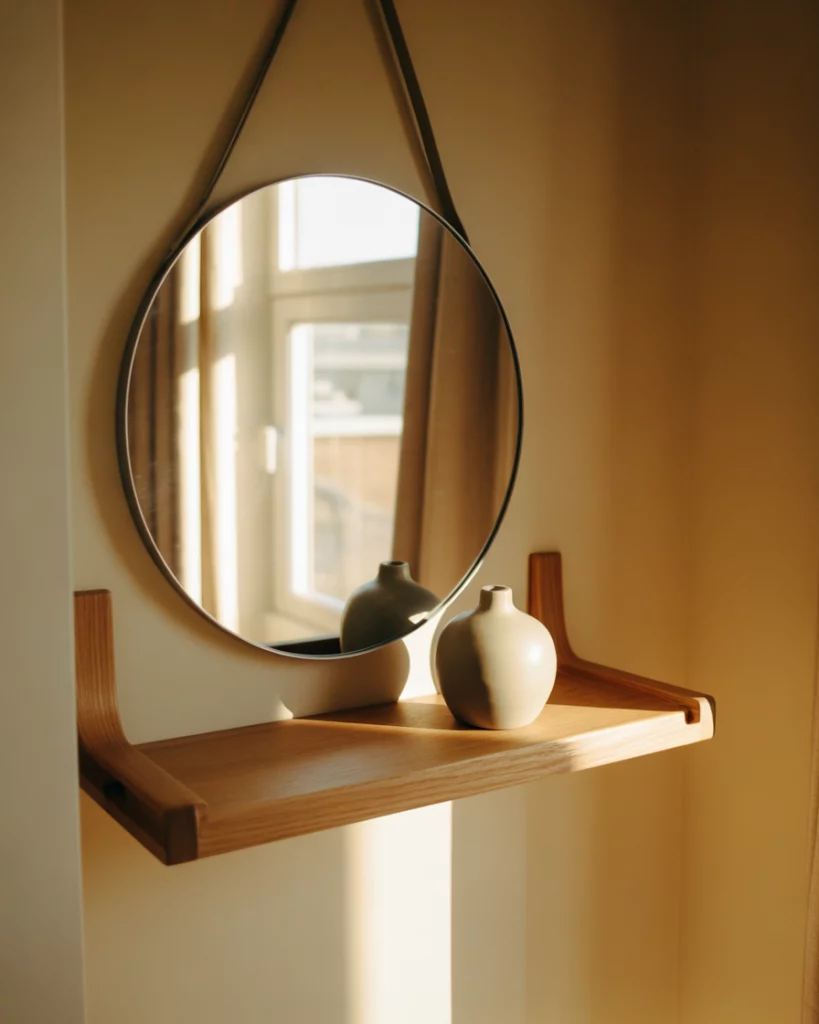 A mirror paired with a shallow shelf brings both utility and charm to compact foyers. The reflective surface brightens the entrance, while the shelf offers a landing spot for keys or greenery. This idea adapts effortlessly to DIY-friendly spaces where custom storage is limited. Choose a shelf no deeper than 4–6 inches to maintain comfortable walking clearance. It keeps the area tidy while avoiding accidental bumps in narrow foyers.