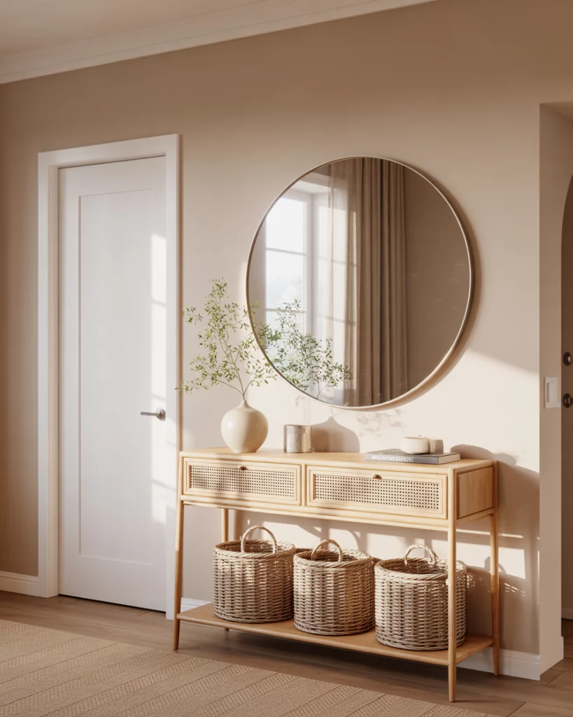 A round mirror in the entry instantly sets a warm, friendly tone. Its soft curves complement both rustic and modern homes, especially when paired with a rattan frame or a simple circle silhouette. It’s an easy décor win that plays nicely with small foyers and narrow console tables. American households often treat the entry as a multitasking zone—keys, bags, mail, and quick outfit checks. A round mirror supports this real homeowner behavior while still looking intentional. It’s a décor piece that earns its keep daily.