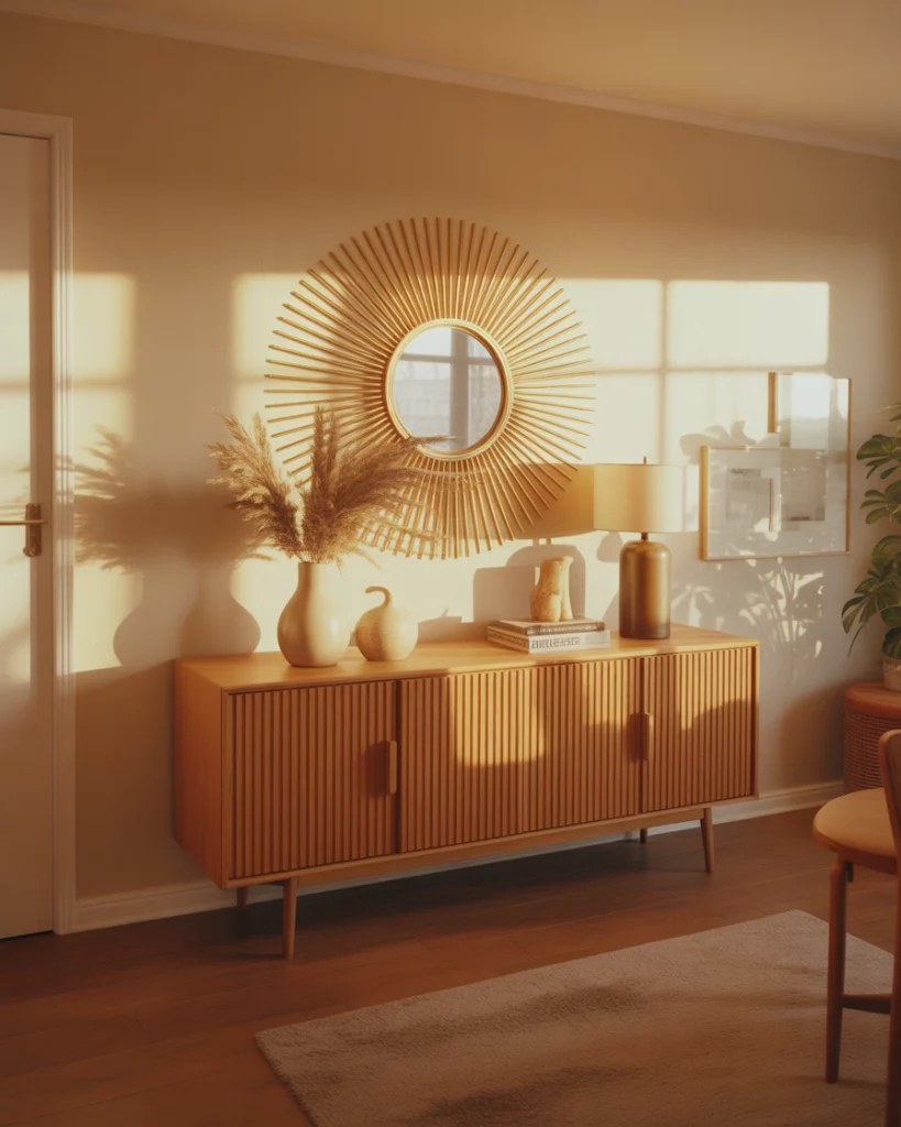 Sunburst mirrors bring energy and nostalgia, perfect for a living room that needs a focal point without heavy artwork. Their radiating arms add motion and warmth, whether finished in brass, wood, or mixed textures. A single bold piece keeps the design from feeling cluttered. Americans often anchor their living rooms around a single statement piece, and the sunburst mirror fits that instinct beautifully. It brings instant brightness to rooms without large windows, adding a cheerful lift even on overcast days.