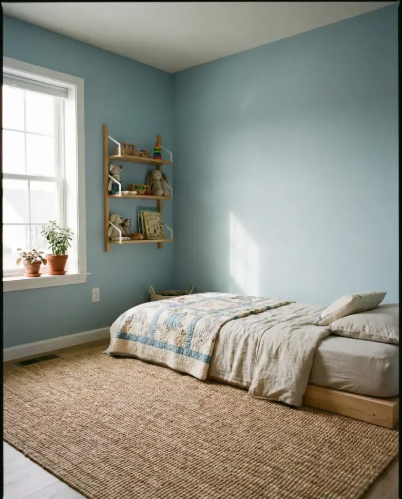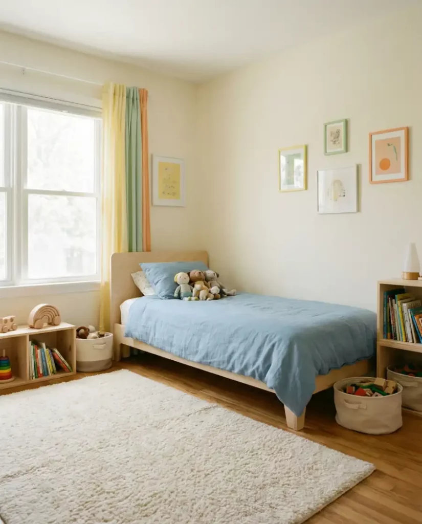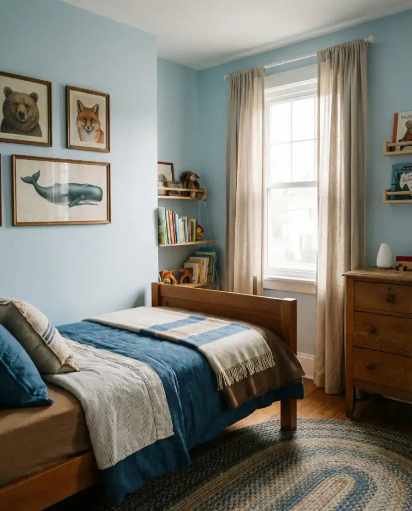 For practicality, washable paint and layered bedding matter more than decorative extras. Kids at this age spill, climb, and rearrange constantly, so durable finishes save time and stress. A neutral blue base also allows easy swaps later—change the rug or wall art, and the room instantly grows with the child.