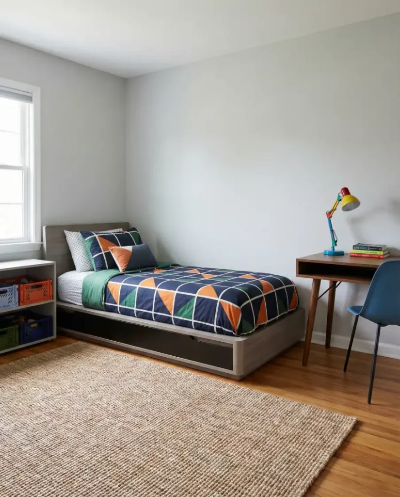 This room is for a teen that loves gaming. It combines a gamer setup and some Colorful accents. A balanced palette makes the desk and screen area the focus and adds to the bedroom. It has an energetic feeling that is also appropriate for sleep and downtime. Many American families notice that teens are more likely to keep the room organized when the setup feels intentional rather than temporary.