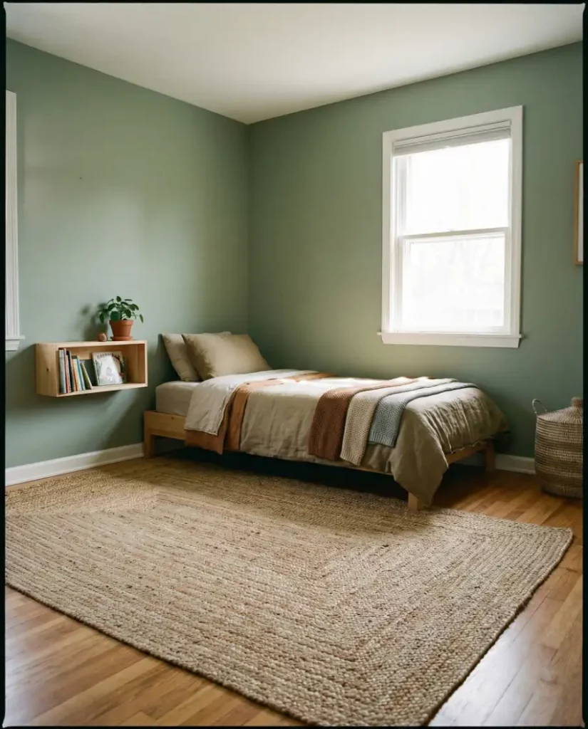 The light greens, sandy beiges, and relaxing textures create a space that feels calming, appealing to teens avoiding cluttered spaces.