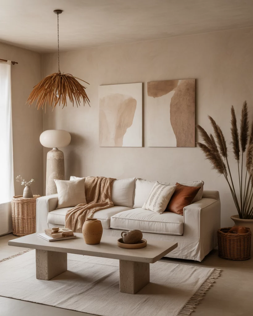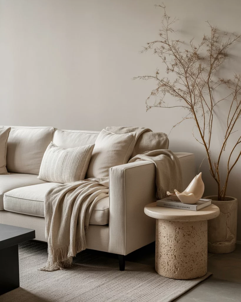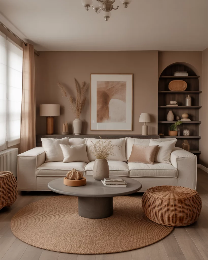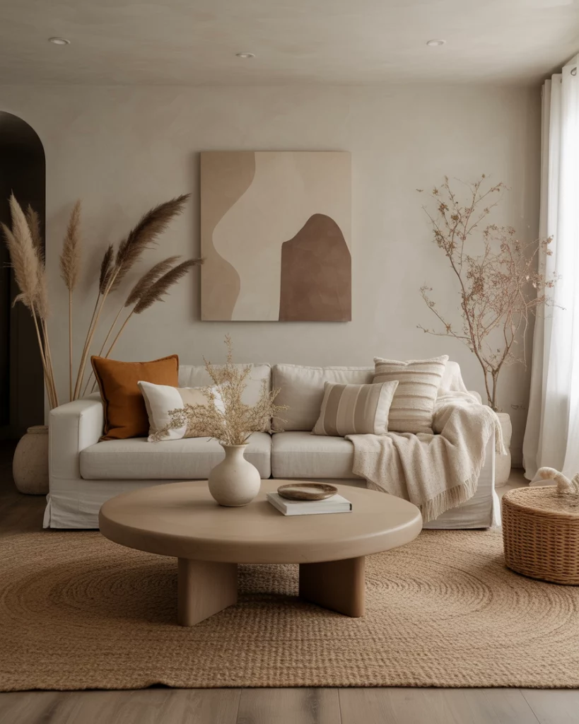 Mixing textures is one of 2026’s most reliable ways to create a cozy neutral living room without visual noise. Pair linen sofas with wool throws, stone tables, and soft cotton cushions for depth that stays subtle. Even small brown or beige ceramics help keep the palette warm and grounded. This idea works well for open-plan apartment layouts where tactile comfort makes the space feel lived-in and personal.