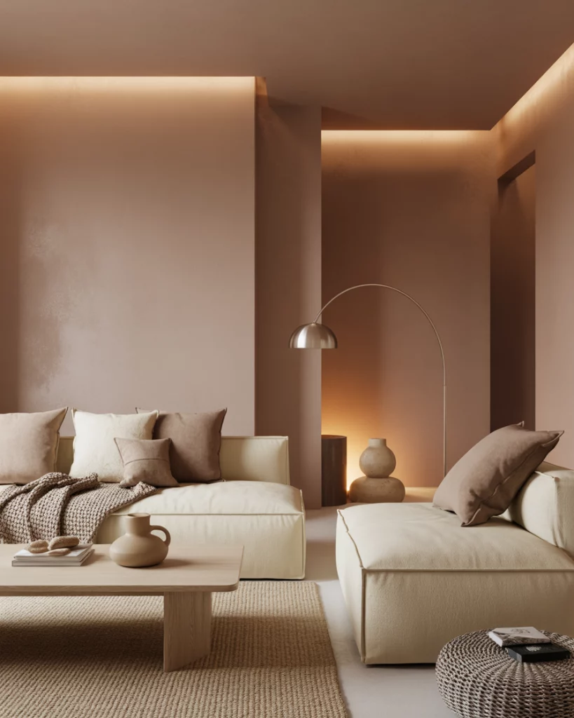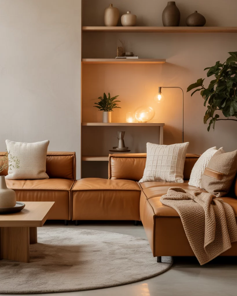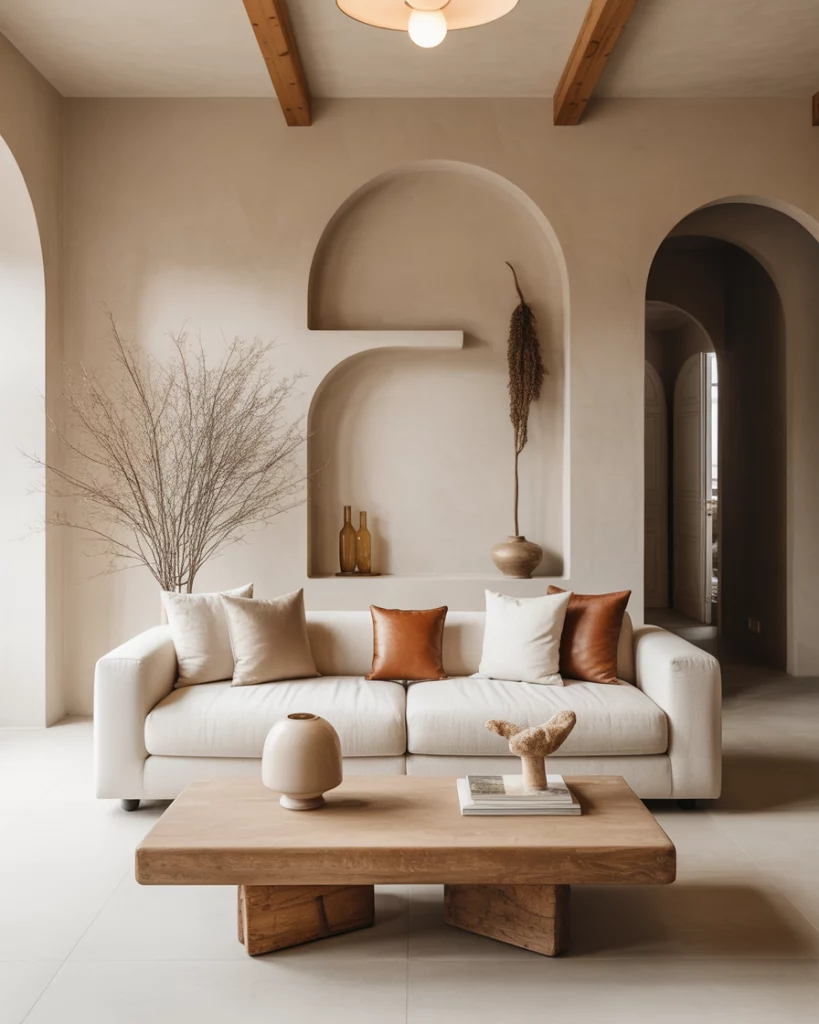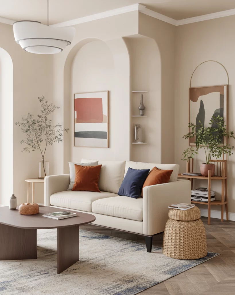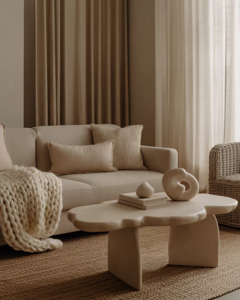 Mixing textures is one of 2026’s most reliable ways to create a cozy neutral living room without visual noise. Pair linen sofas with wool throws, stone tables, and soft cotton cushions for depth that stays subtle. Even small brown or beige ceramics help keep the palette warm and grounded. This idea works well for open-plan apartment layouts where tactile comfort makes the space feel lived-in and personal.