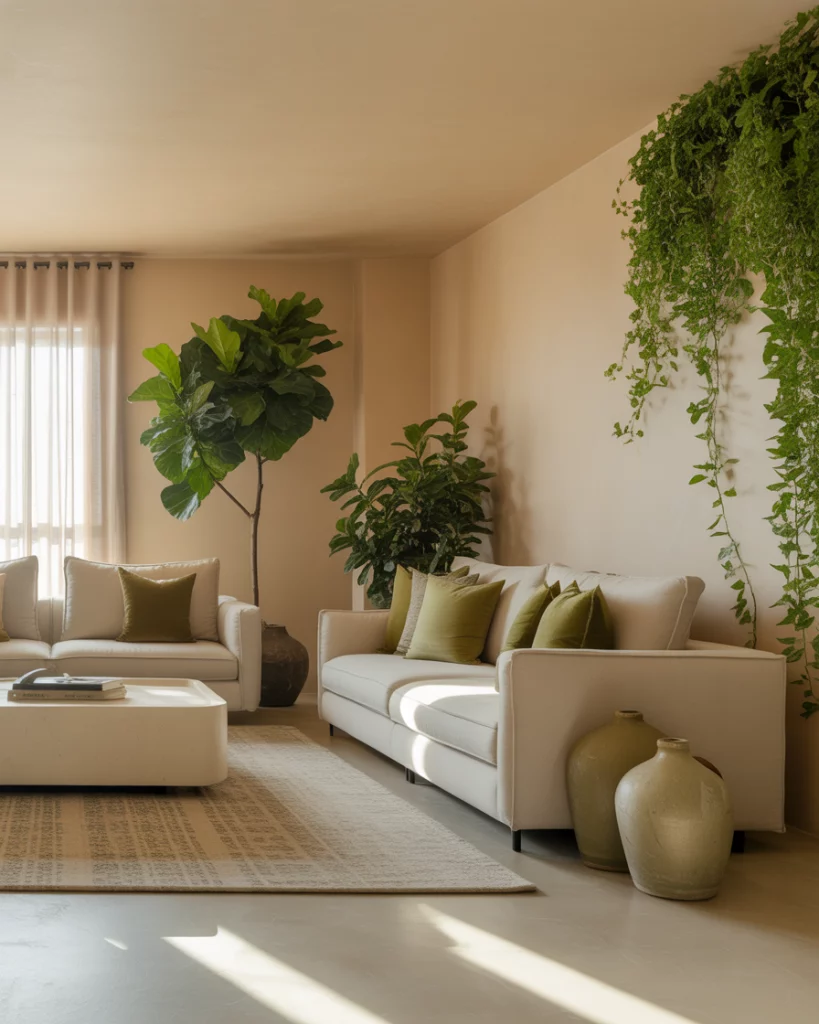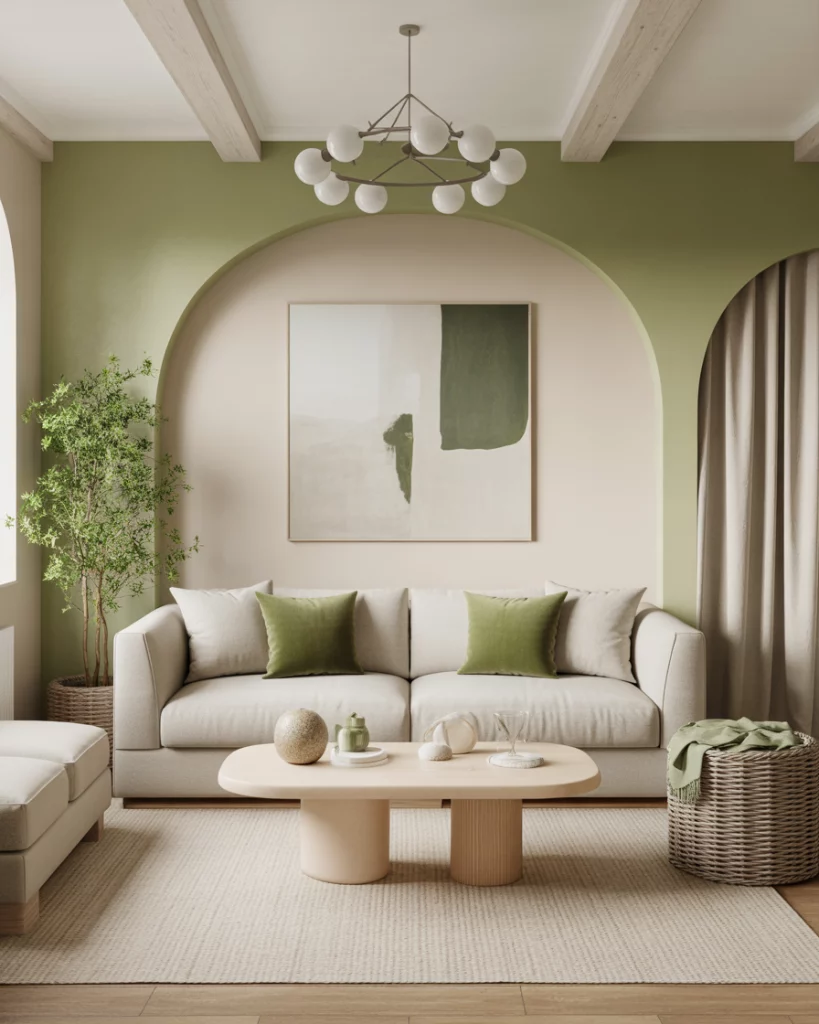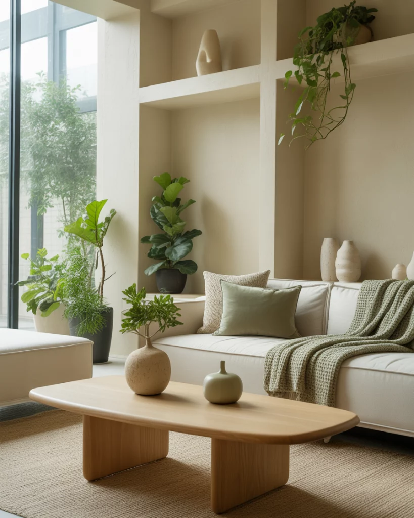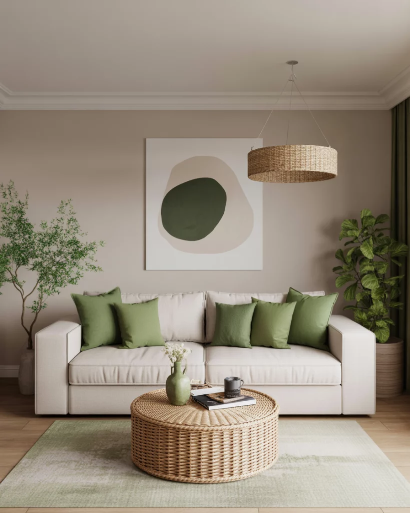 Neutral living rooms gain depth when softened with green accents—from muted sage pillows to eucalyptus stems that offer gentle visual rest. This is a smart choice when you want to add color without disrupting the neutral base. Many designers call it their “gateway color” because it blends effortlessly into earth-focused palettes.