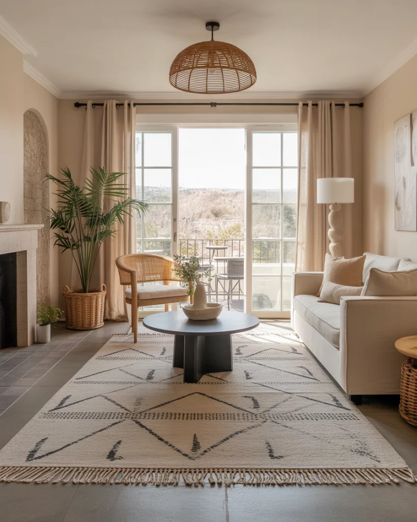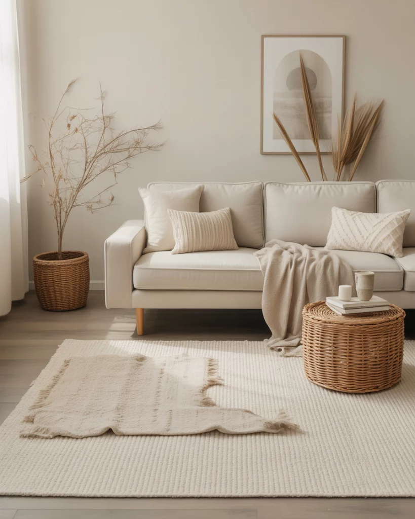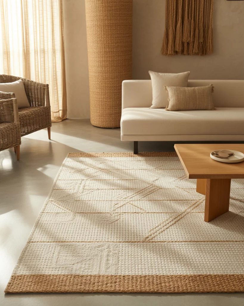 In open layouts, a distinctive rug becomes more than decor—it defines zones and adds structure to neutral spaces. Textured rugs with soft geometric patterns or tight weaves help maintain simplicity while offering subtle personality. Designers often choose rugs that align with the room’s natural fiber theme without detracting from clean lines.