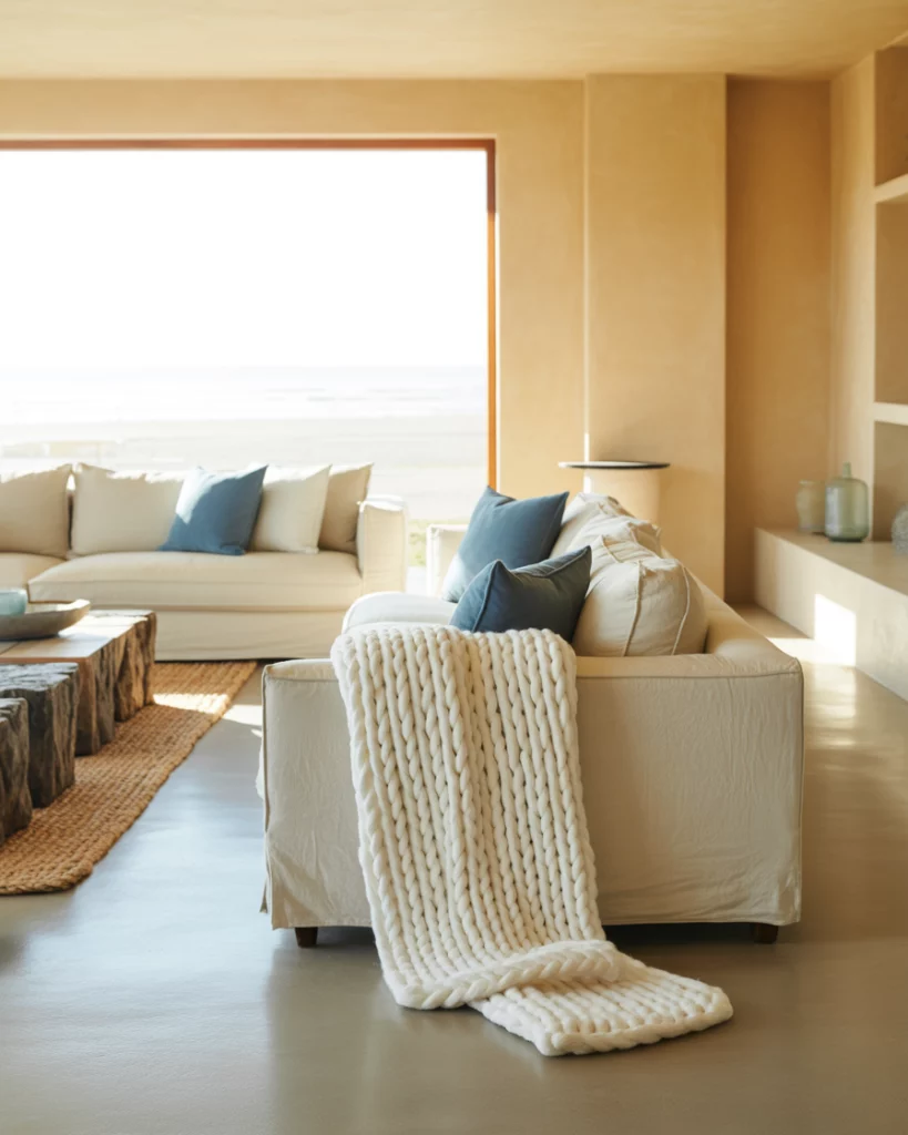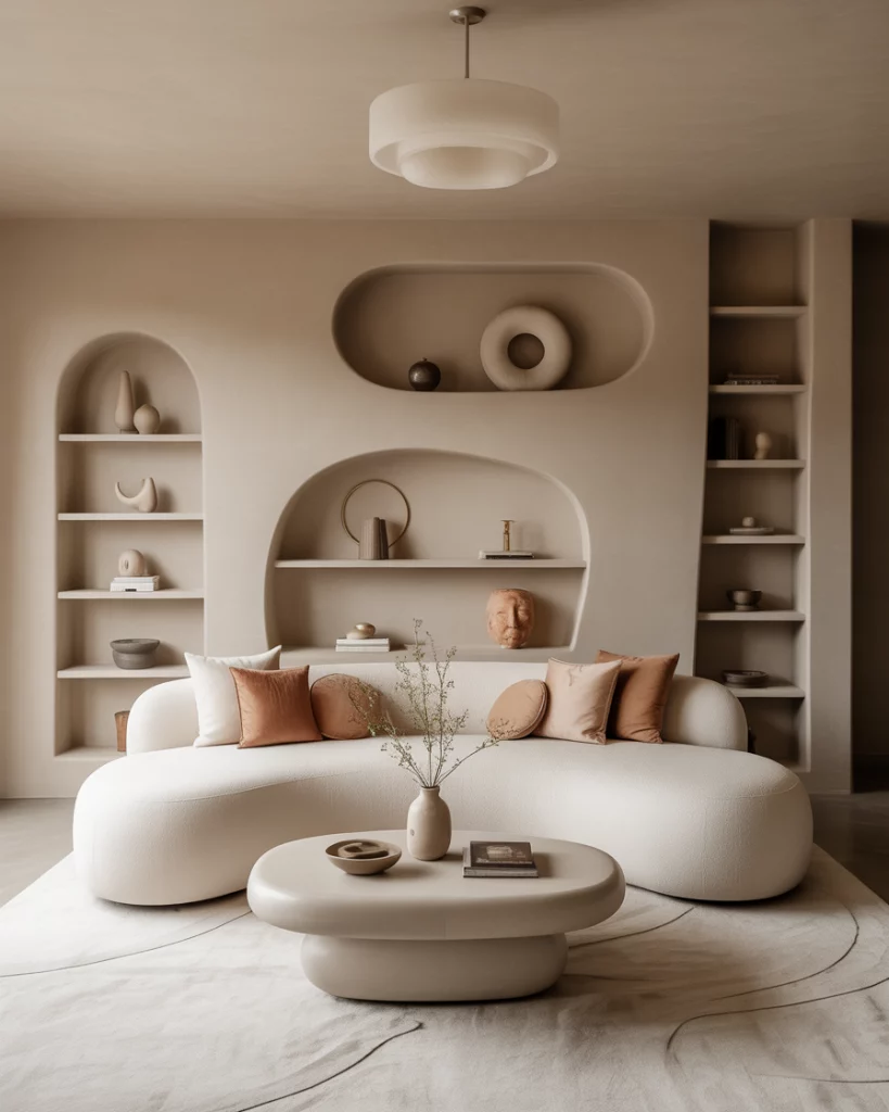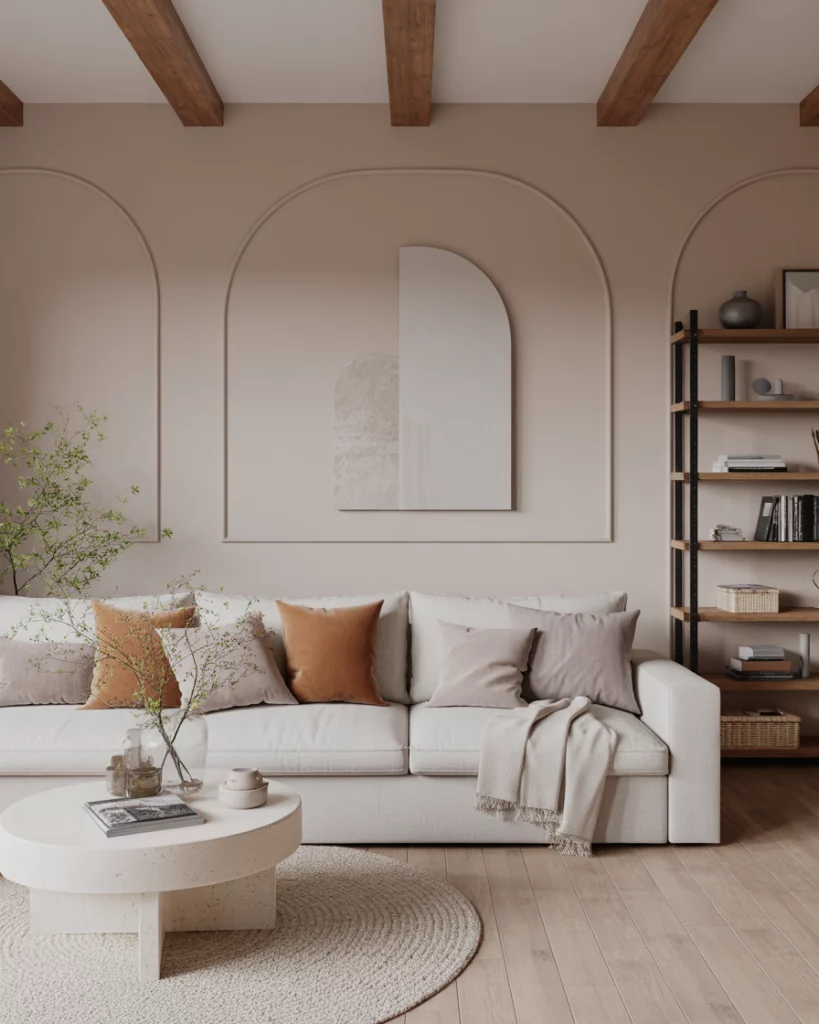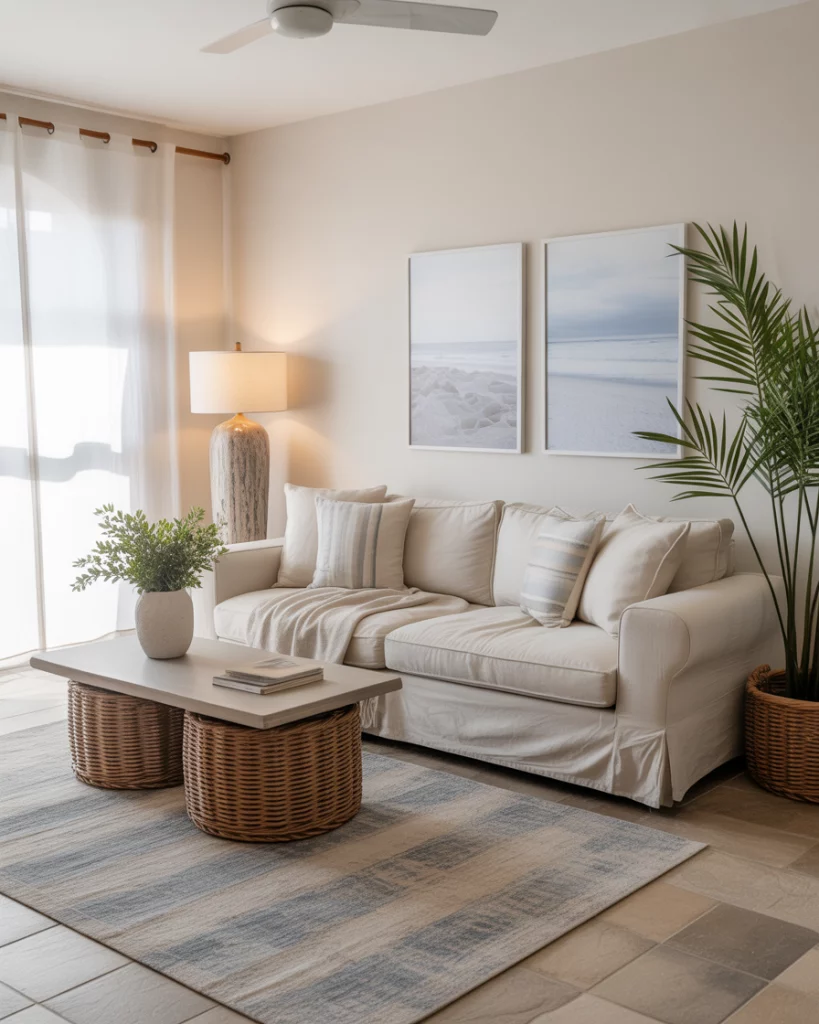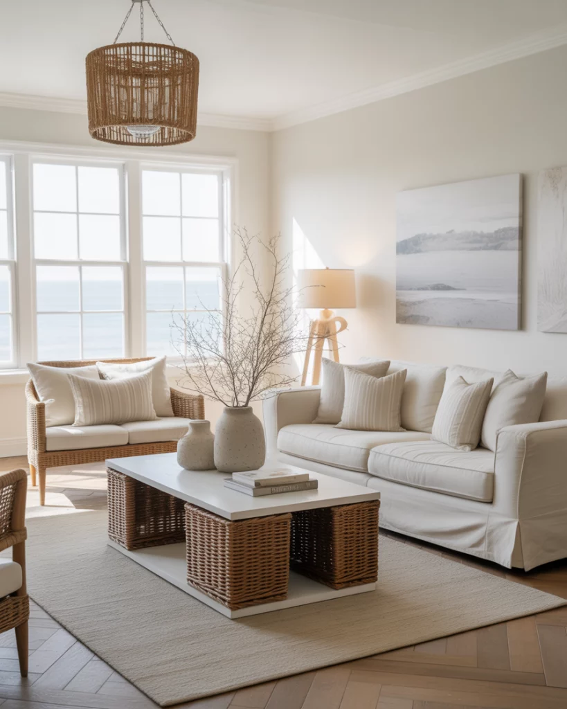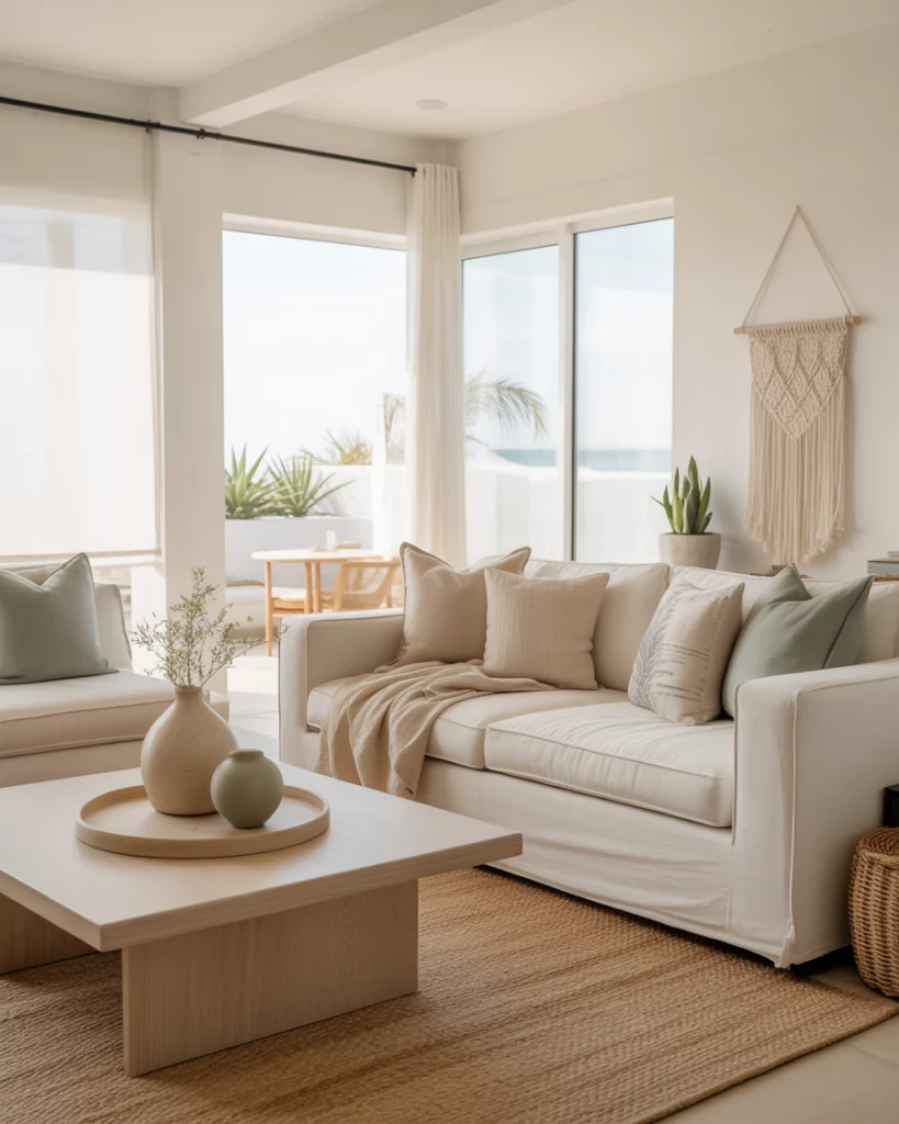For those who love the calm of coastal living rooms but prefer soft tones, tiny touches of muted blue or sandy pink are a simple way of adding color without breaking the neutral harmony. This style is airy and fresh, especially in bright rooms near large windows. Gentle hues inspired by sky and shore keep everything peaceful and balanced.
