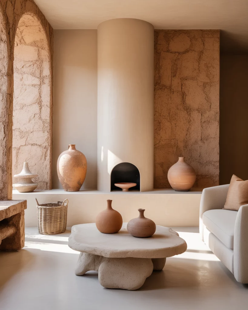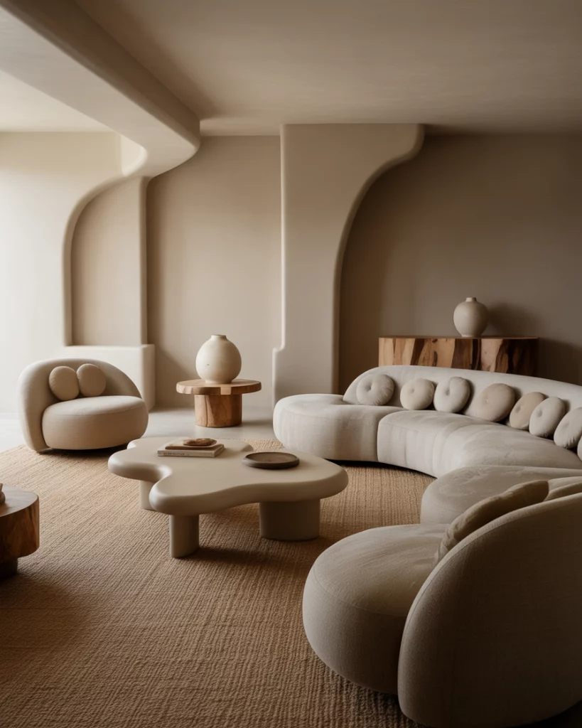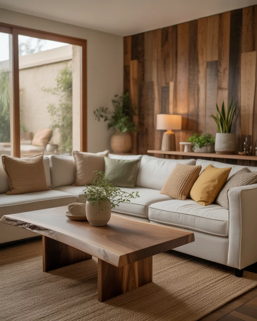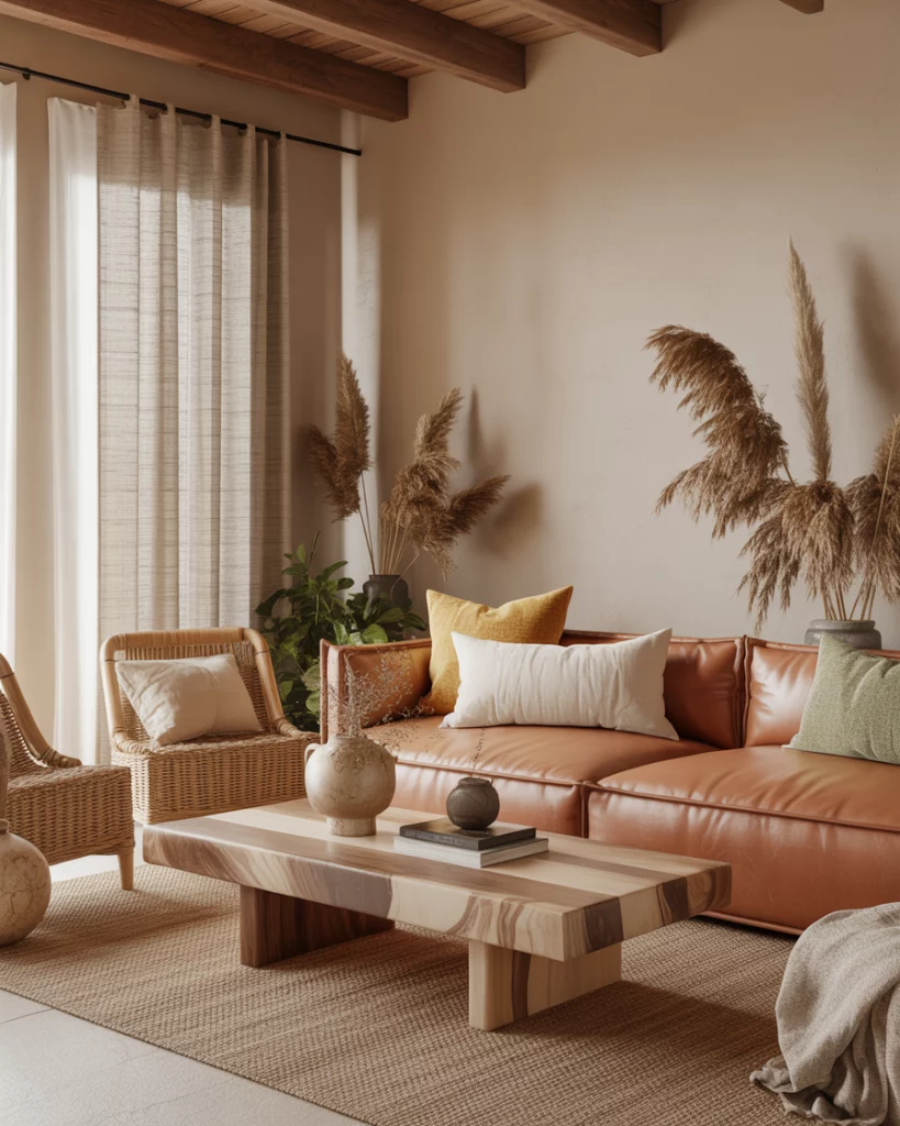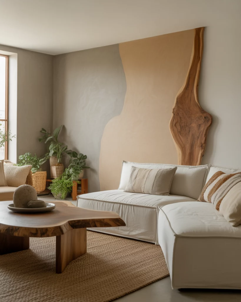 A rising 2026 trend blends organic elements with sleek modern design—think smooth wood tables, stone décor, and soft linen paired with minimal lines. This look works for people wanting a grounded feel while staying modern and clutter-free. A few handmade pieces, like pottery or woven stools, add quiet personality without disrupting the neutral flow.