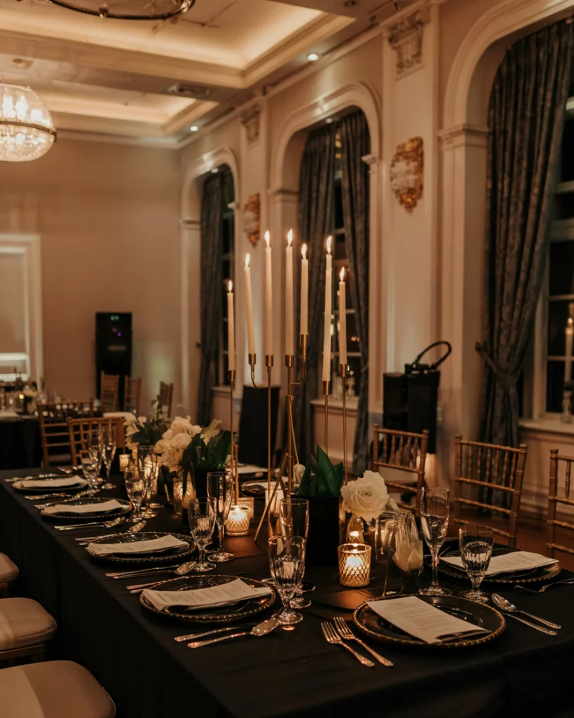 Set the tone with a black tie theme reflected in sleek decorations, shimmering fabrics, and metallic accents. A refined color palette of black, gold, and silver elevates the evening’s aesthetic, while velvet linens or crystal glassware bring depth to the design. The look works beautifully in ballrooms or loft spaces where elegance meets celebration.