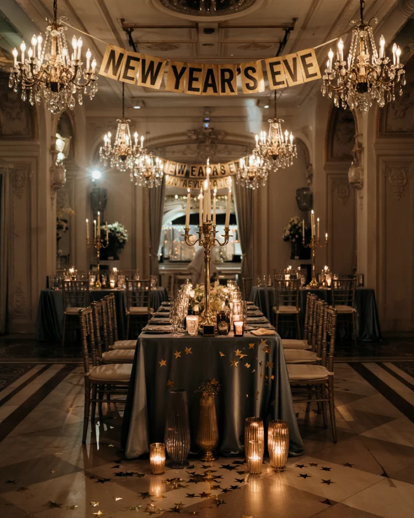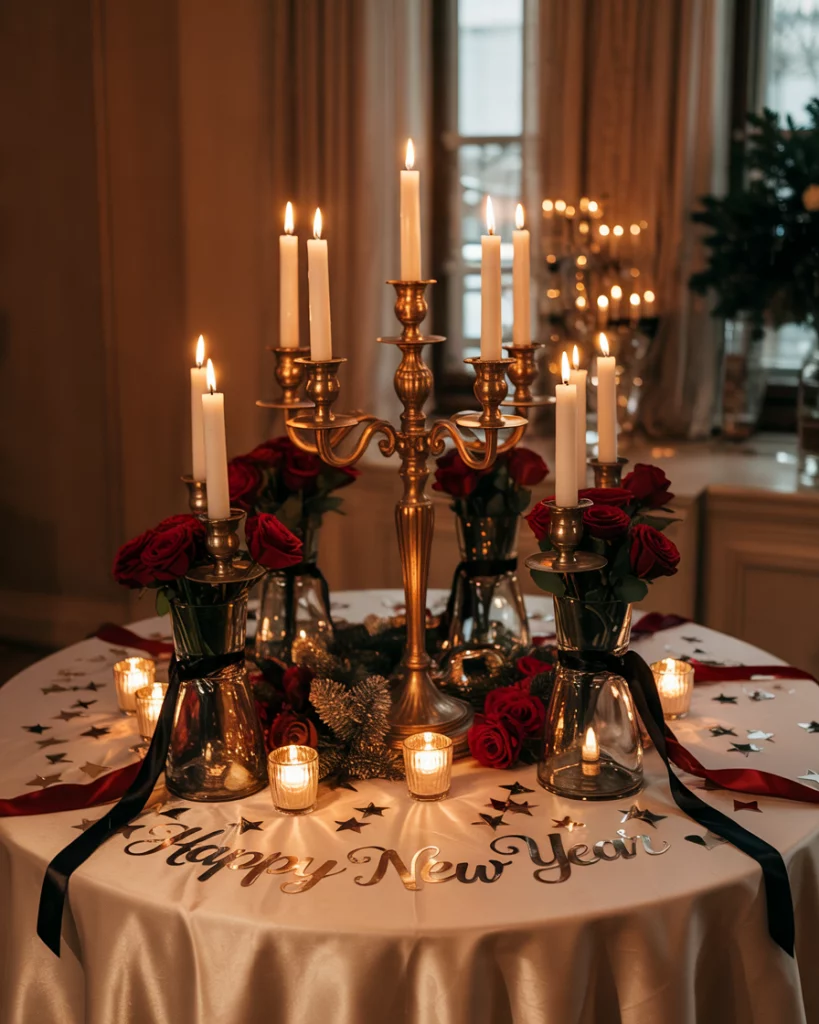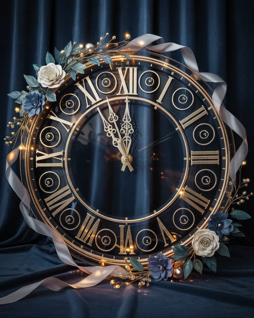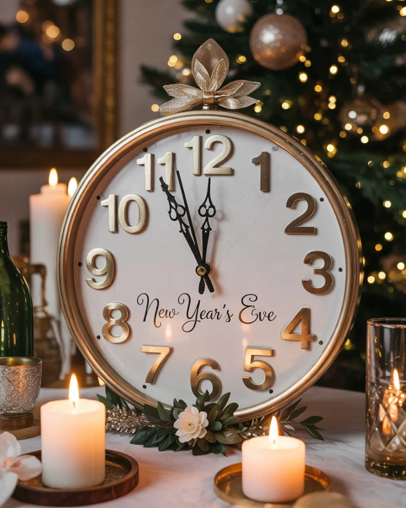 A dramatic countdown clock is both functional and decorative, signaling midnight’s arrival. Integrated into the reception décor, it can feature bold colors like black, gold, or silver. Surrounded by candles or confetti, it becomes a striking focal point.