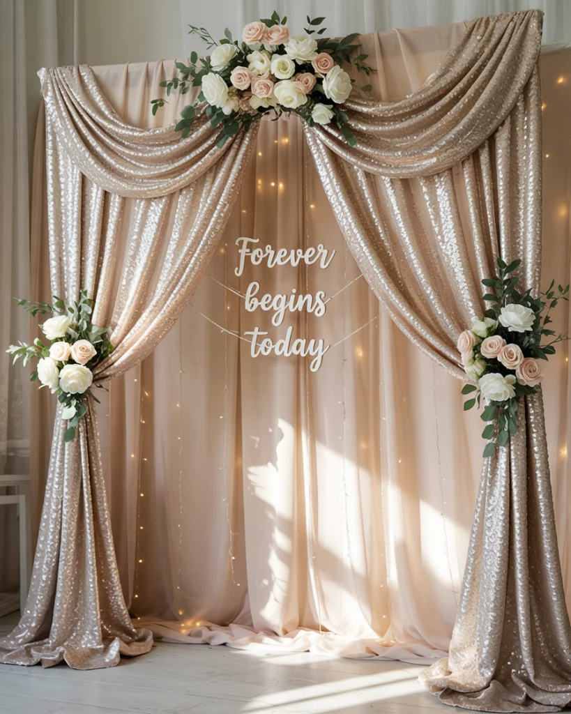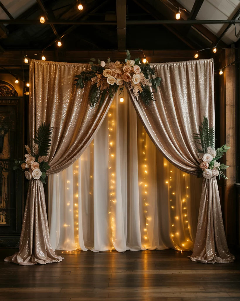 A sparkling backdrop with sequined drapery, fairy lights, and mirrored panels creates a cinematic setting. Adding frosted flowers ties the decorations into the season, while reflective textures enhance the glow. This transforms the ceremony into a breathtaking visual moment.