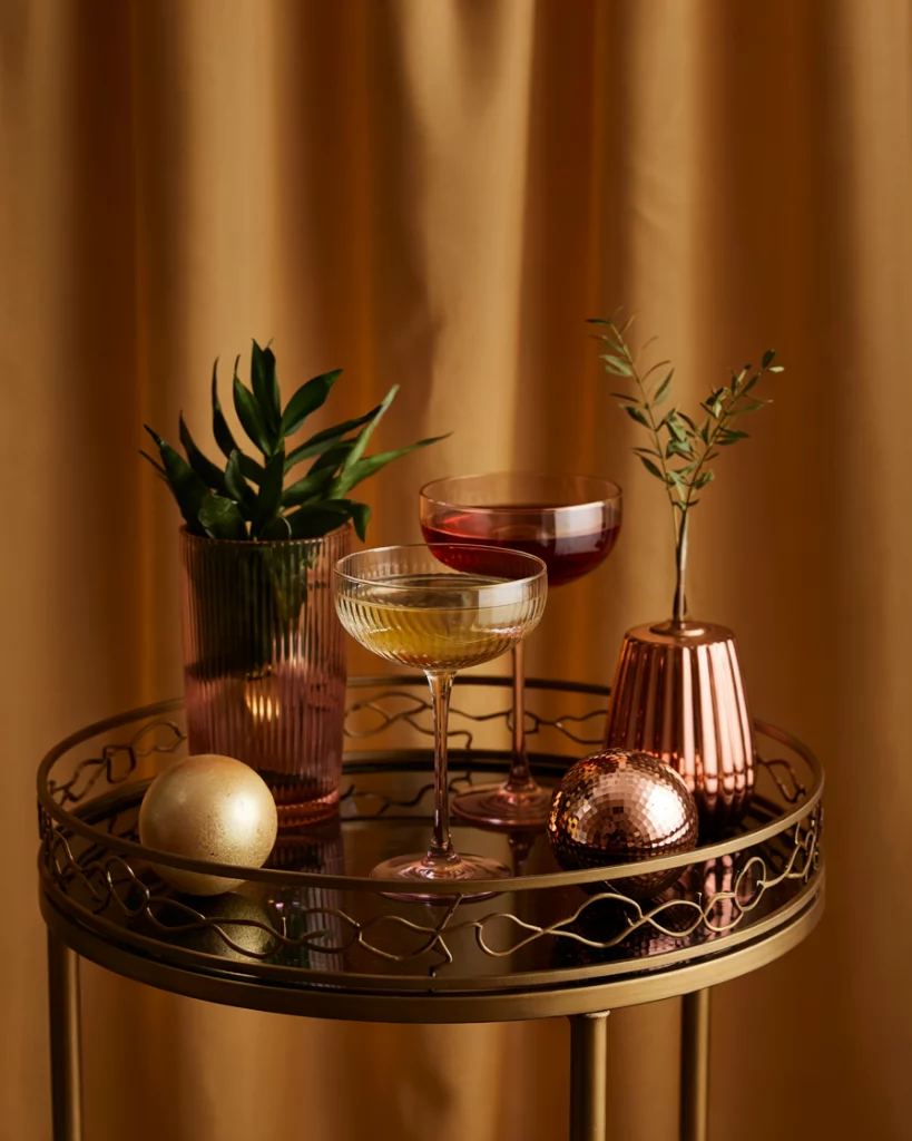 Offer signature drinks displayed on a glittering bar cart or mirrored shelves. Use jewel-toned glassware and metallic straws to tie the drinks into the color palette. This visual detail adds festive sparkle while blending seamlessly into the party atmosphere.