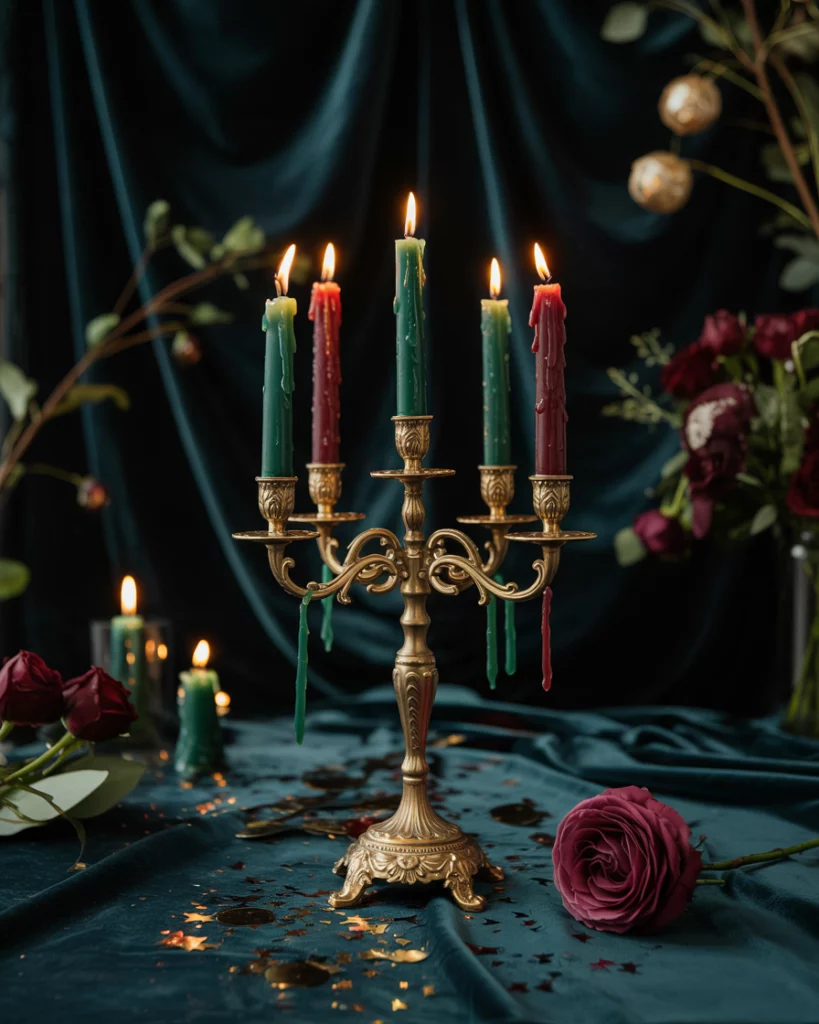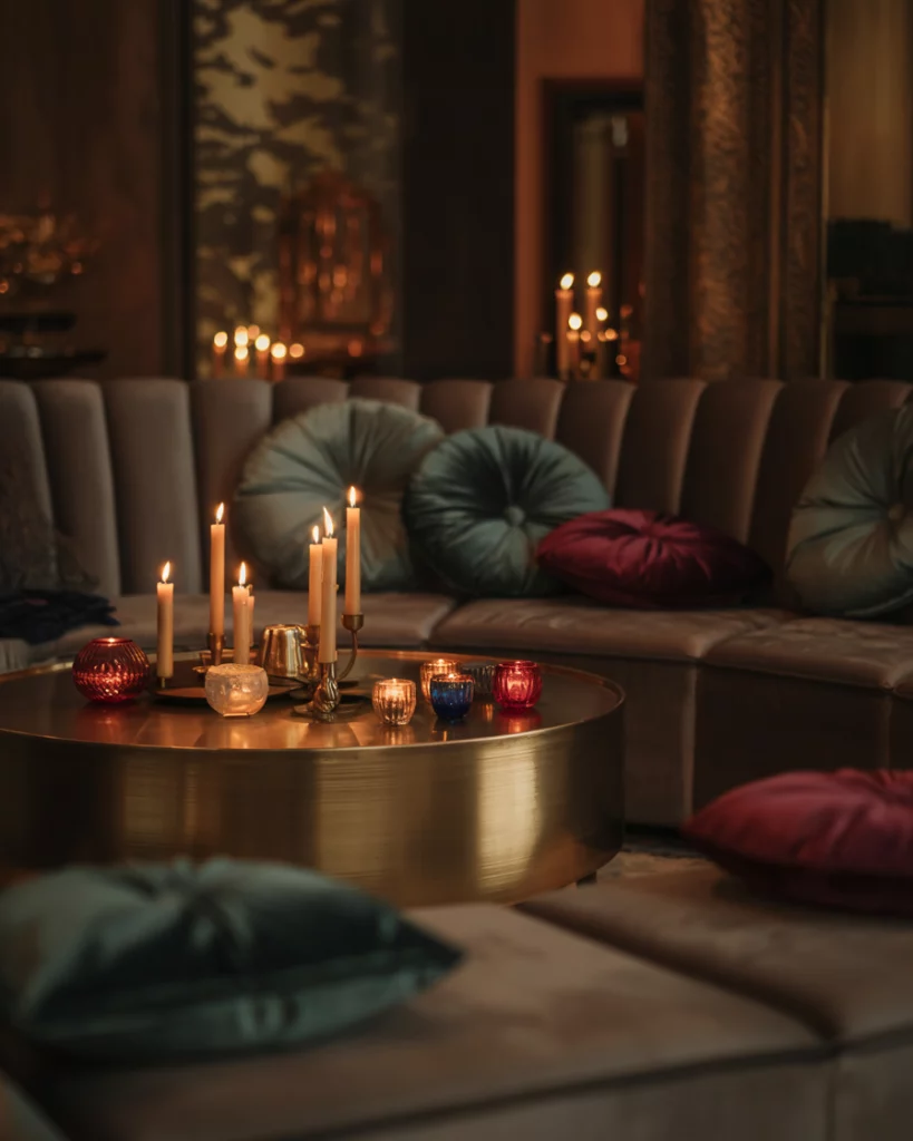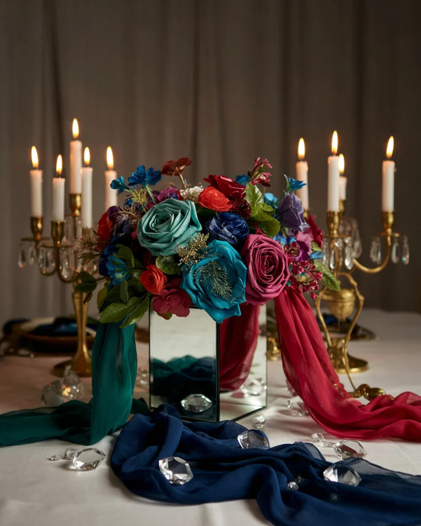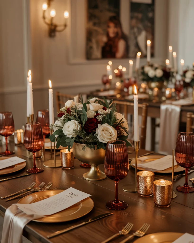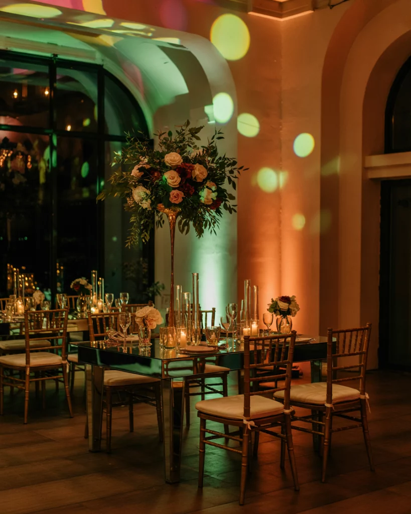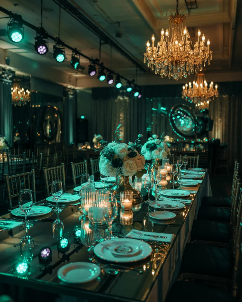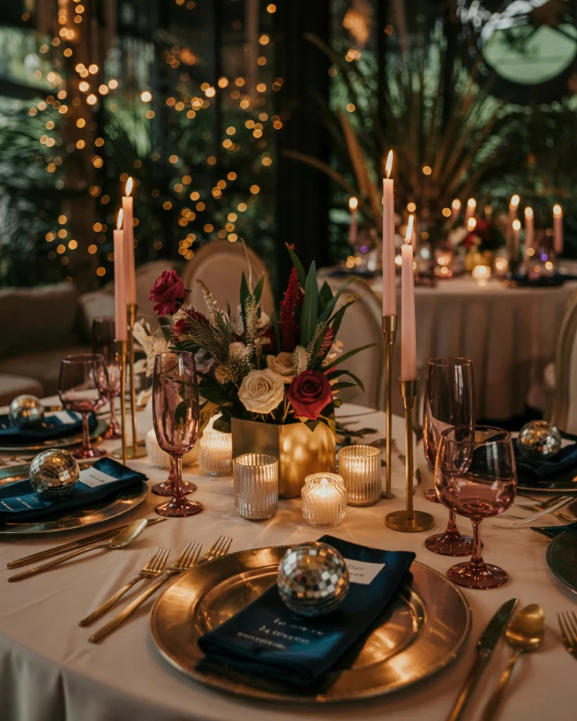 Lighting transforms the space with uplights in jewel colors, shimmering chandeliers, or Edison bulbs. Reflective surfaces like mirrored tables enhance the glow. The effect is a warm, dramatic aesthetic that turns even simple venues into festive masterpieces.
