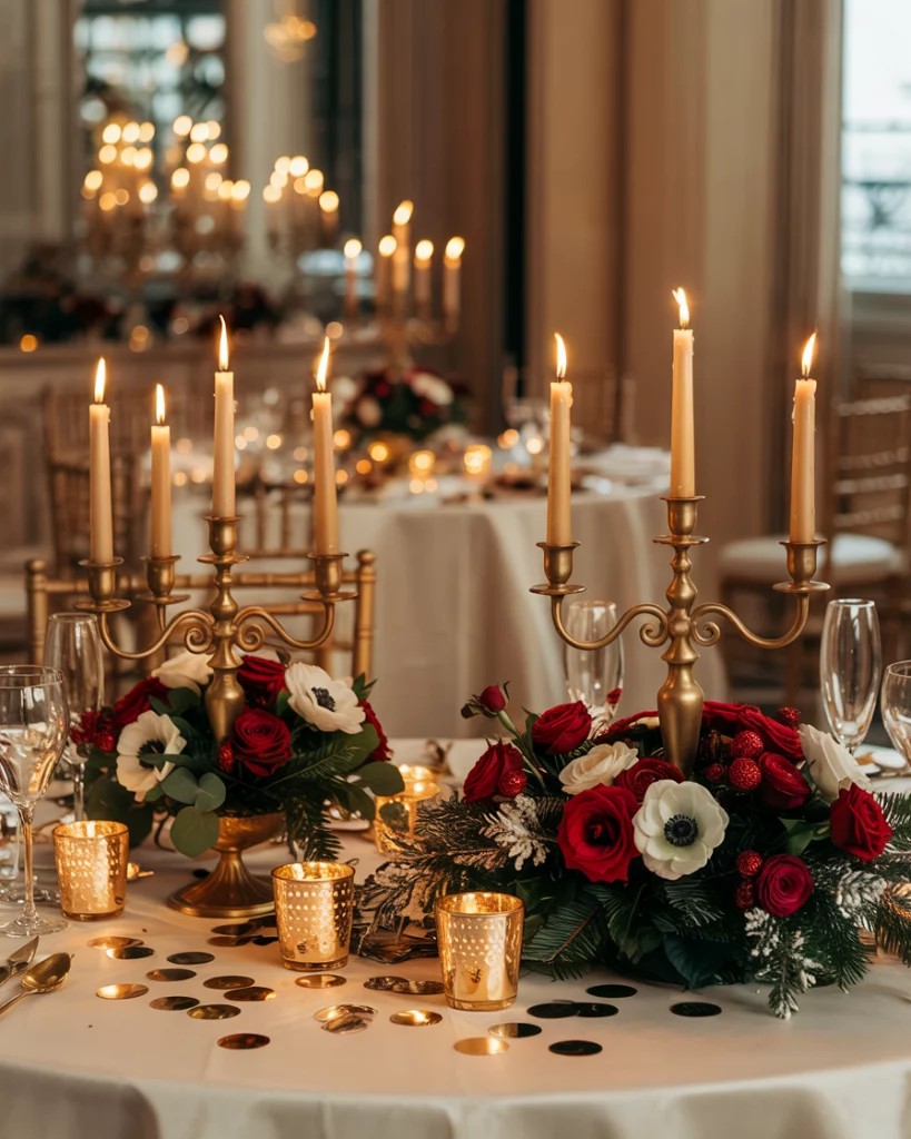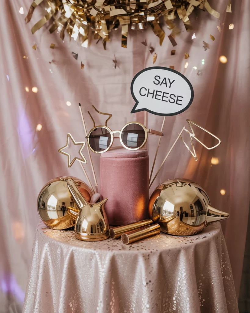 Set up a photo booth with glitter backdrops, metallic props, and confetti-inspired frames. Even without people, the setup itself becomes part of the decorations, adding playful detail to the reception. It balances elegance with holiday celebration.