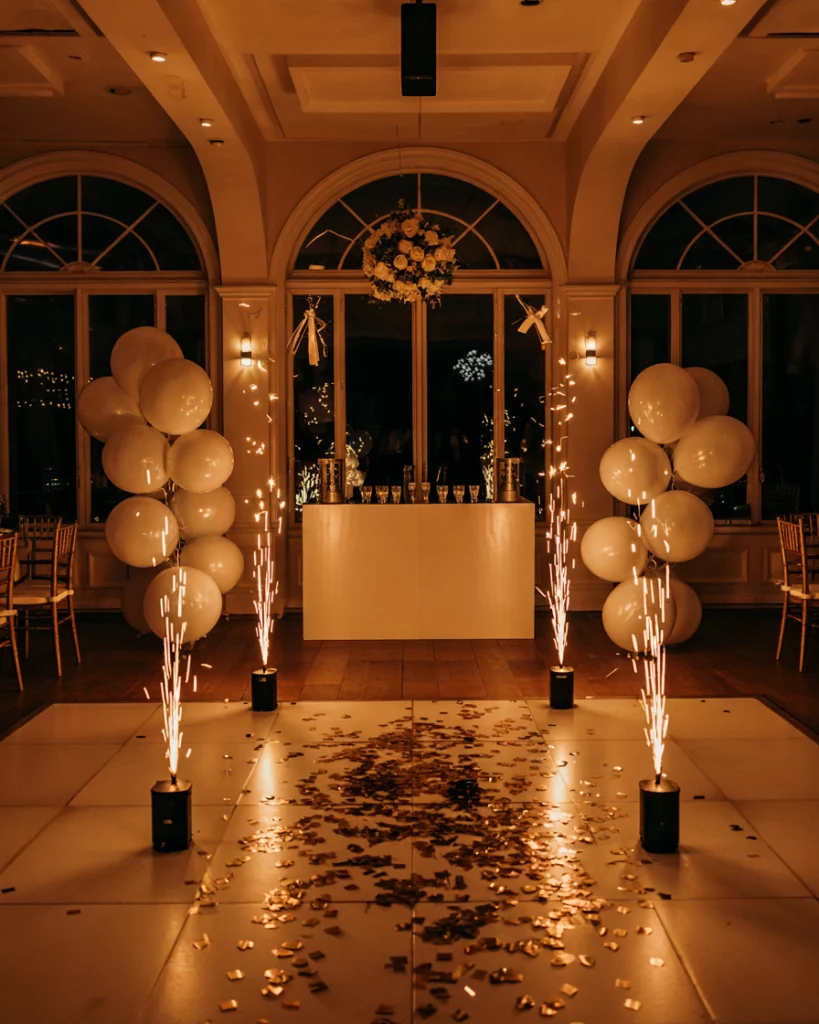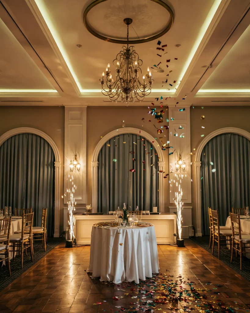 Create an unforgettable design moment with confetti cannons, cold spark fountains, or cascading lights. These elements add spectacle and drama, aligning with the black tie and festive party aesthetic. Even empty, the staging captures the energy of celebration.