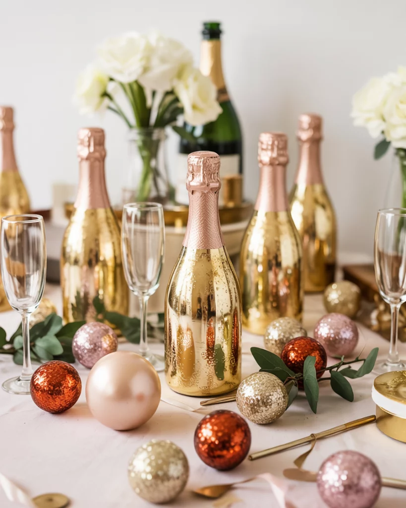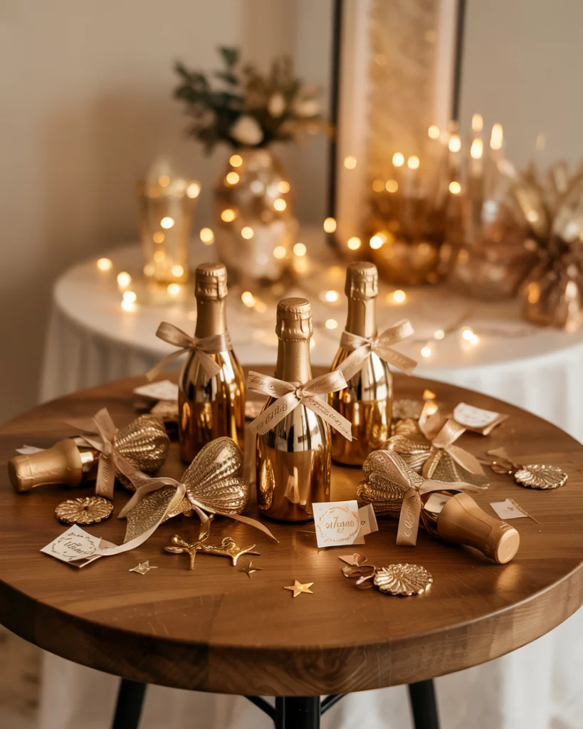 Favors like mini champagne bottles, sparklers, or glitter trinkets double as table decor. Displayed on trays or incorporated into centerpieces, they become part of the design before being taken home. Gold wrapping and metallic bows tie them to the color palette.