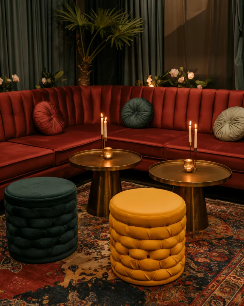 Design lounge corners with velvet couches, jewel-toned pillows, and metallic side tables. Adding candles and seasonal flowers makes the space cozy yet elegant. These areas elevate the aesthetic and create visual depth within the reception.