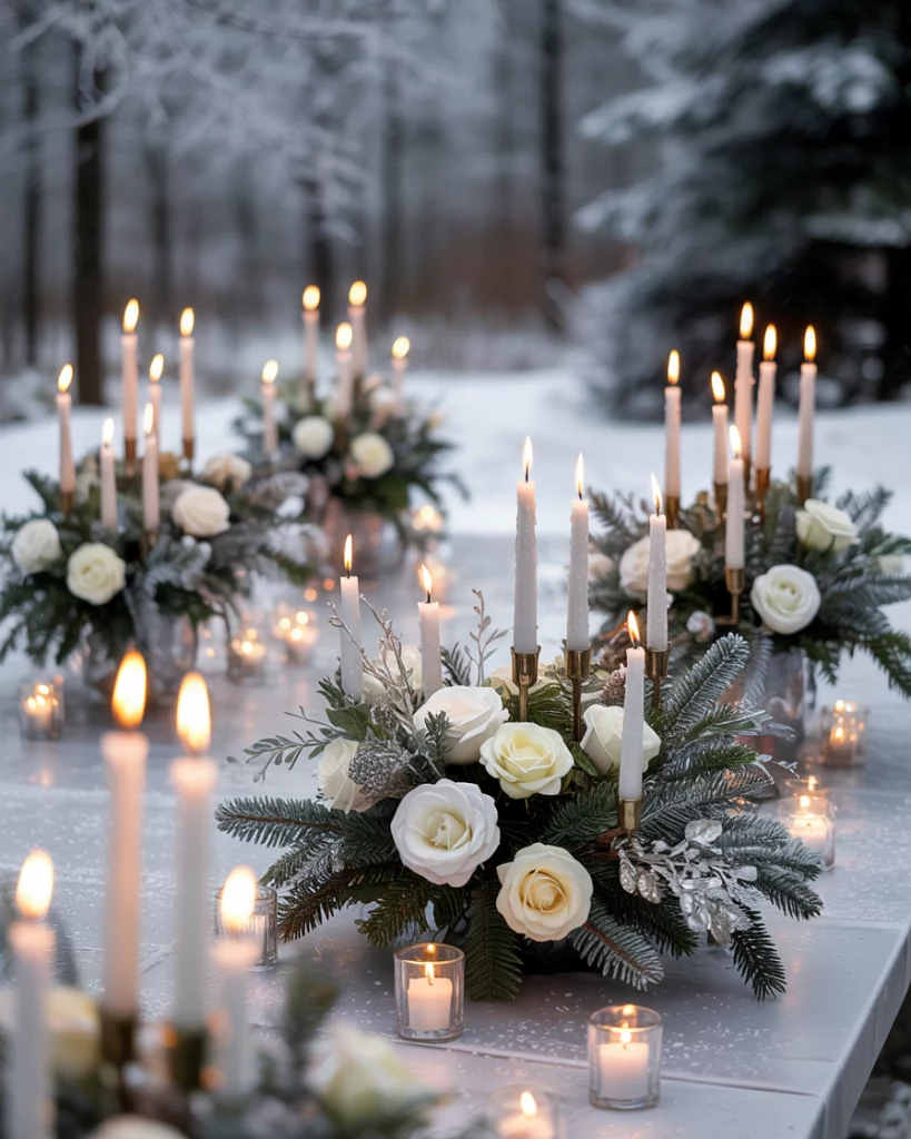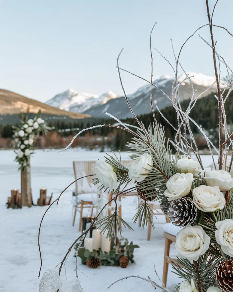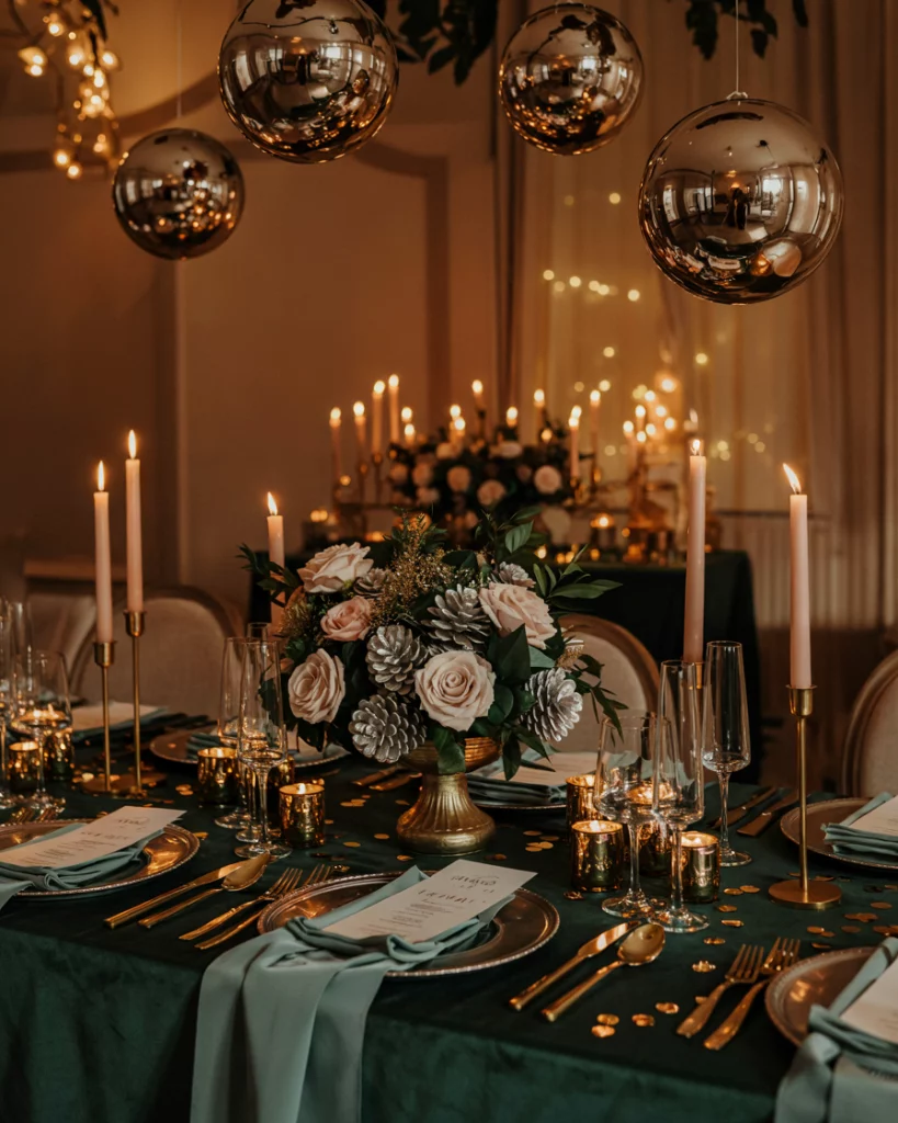 Transform the venue with frosted branches, silver-dusted pinecones, and white flowers. Layered textures create a winter wonderland aesthetic that feels both romantic and festive. Icy metallic accents tie the decorations into the holiday spirit.