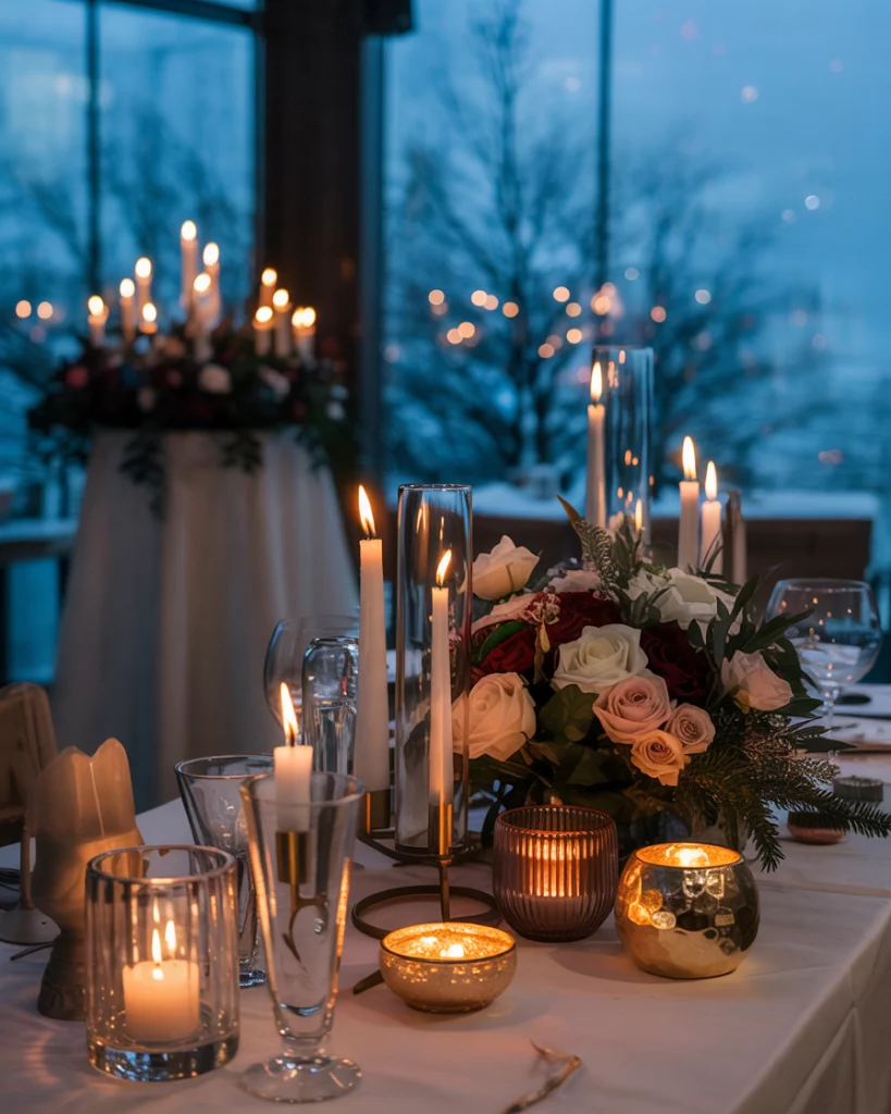 Line the aisle or altar with glowing candles for timeless charm. Combined with metallic centerpieces and seasonal bouquet accents, the soft lighting creates a sacred, romantic setting that balances the festive sparkle of New Year’s Eve.