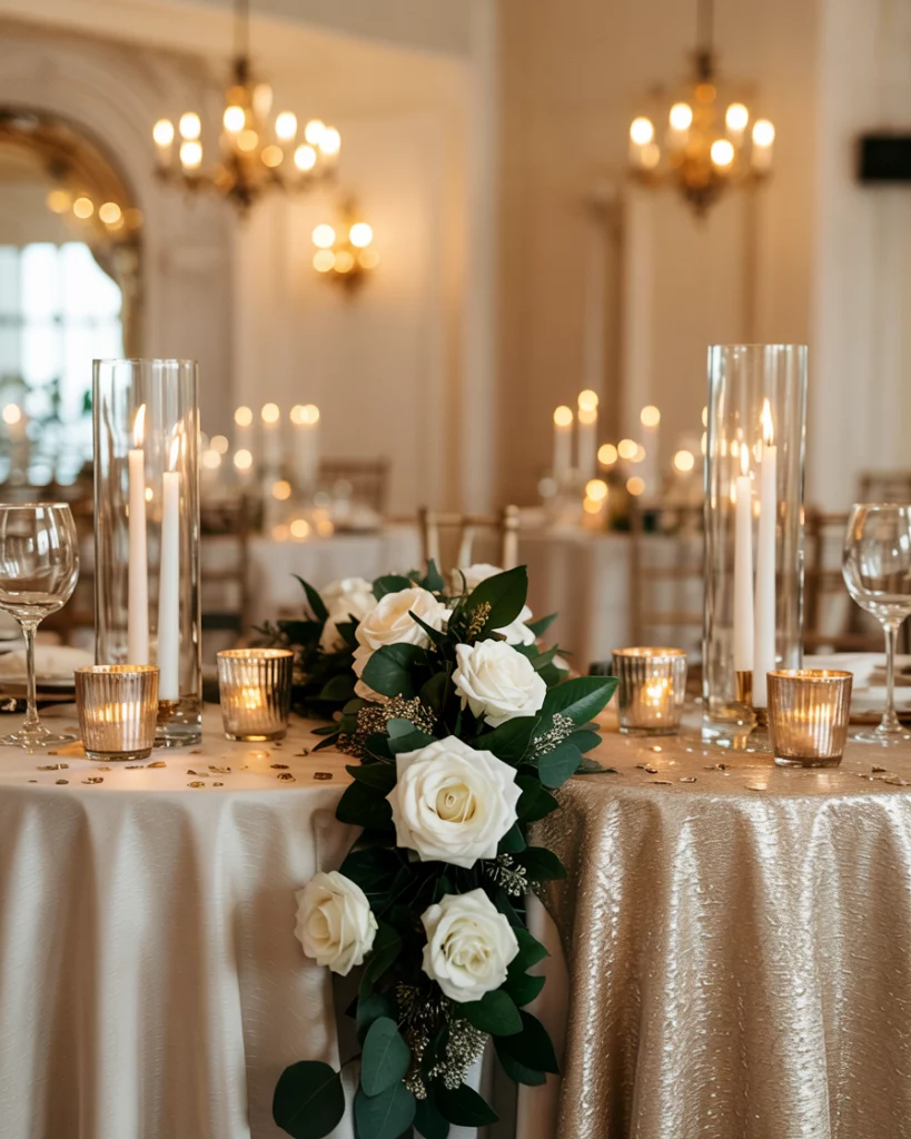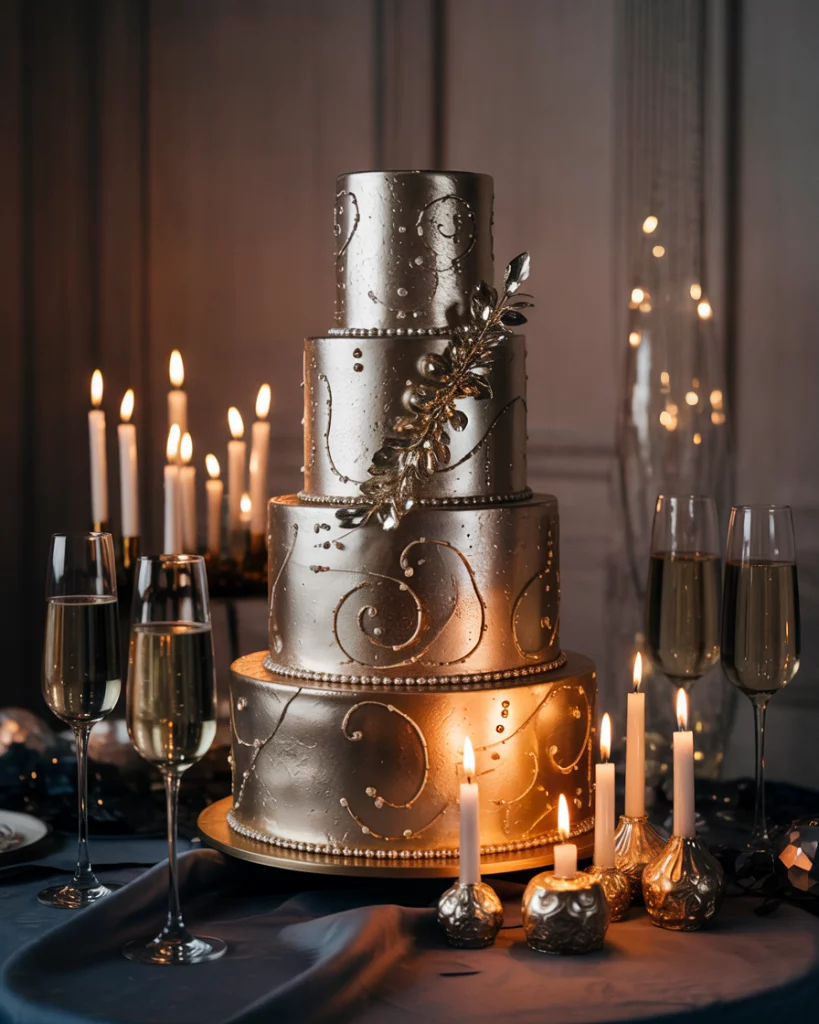 A dramatic cake wrapped in metallic fondant or sugar glitter becomes both dessert and décor. Placing the cake beside champagne flutes and glowing candles emphasizes the celebratory spirit. The design echoes the midnight toast and creates a striking moment in the reception space.
