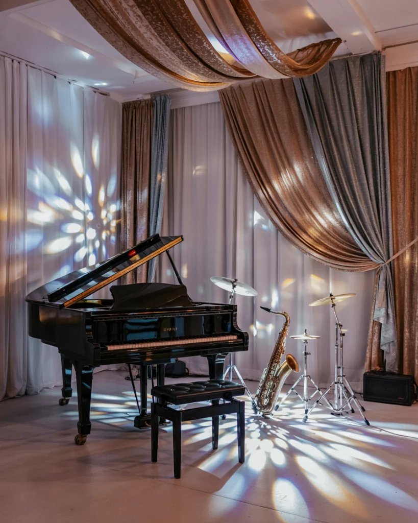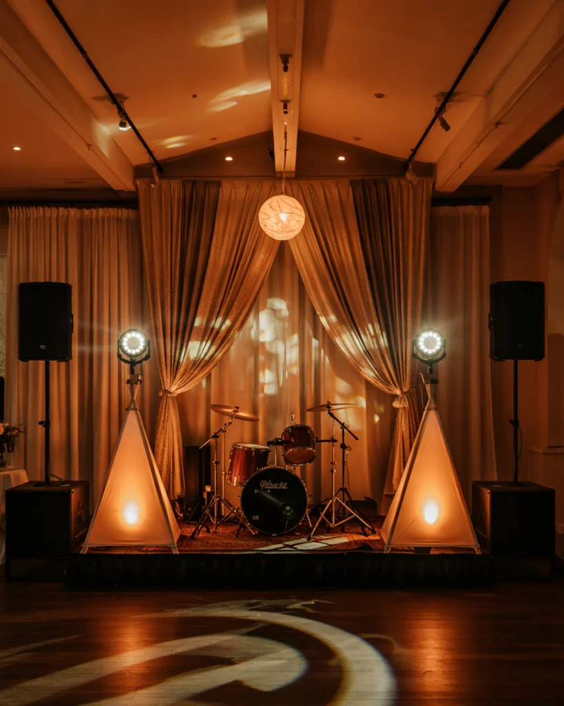 Even without performers, the setup of a stage with instruments, glowing lights, and metallic drapery becomes a decorative highlight. This design reflects the party vibe, ensuring the reception feels lively and immersive through its visual staging.
