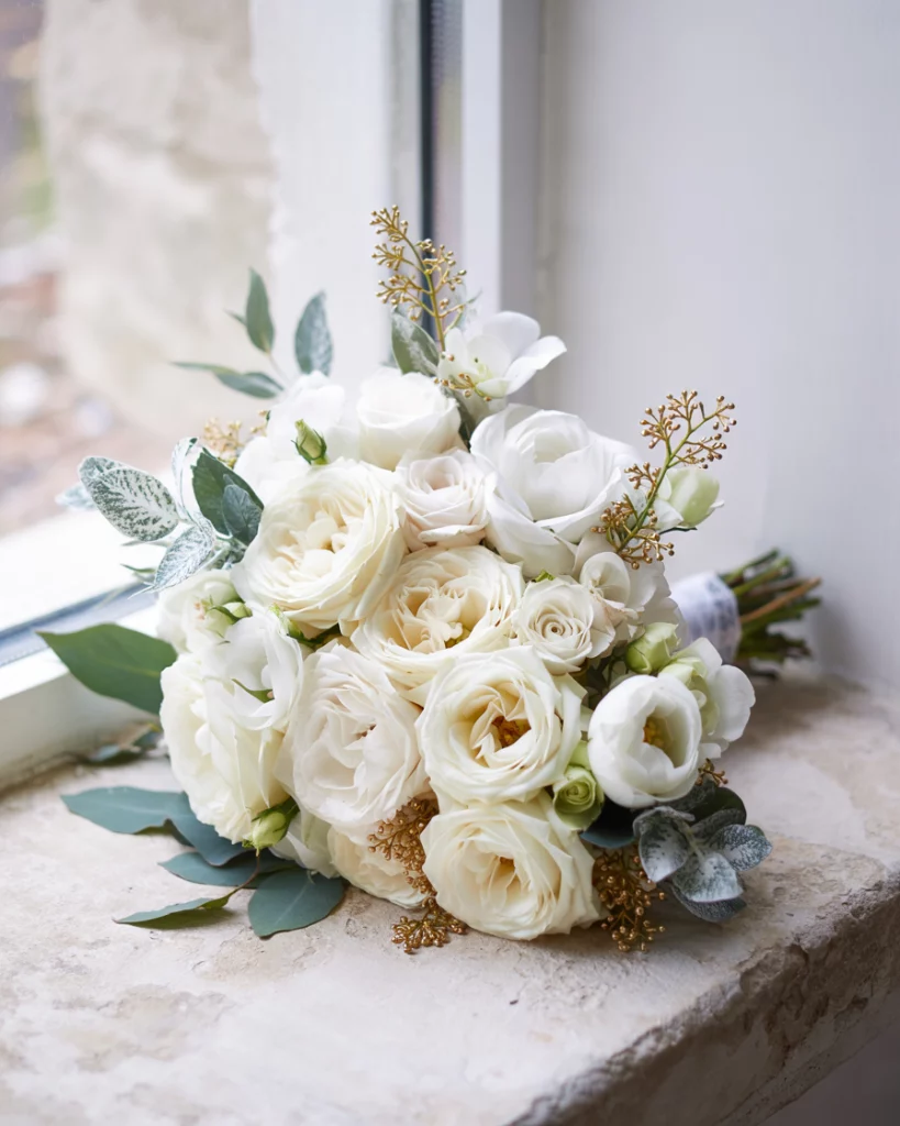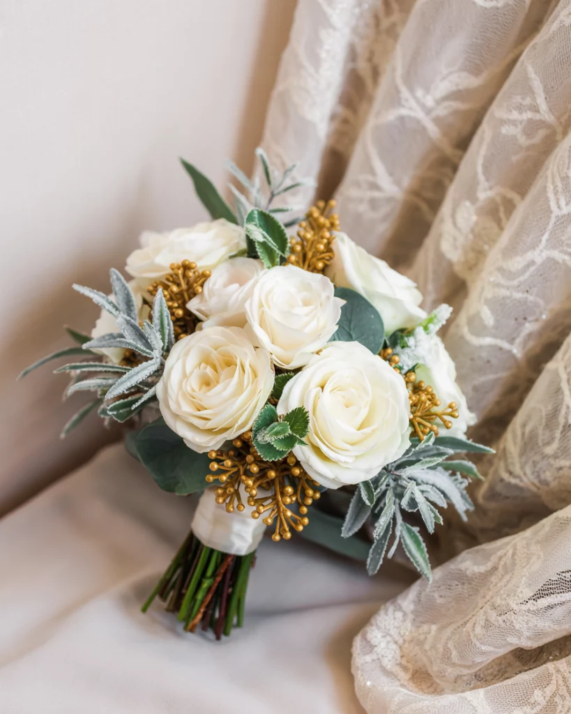 Use a winter-inspired bouquet as part of the decorations—arrangements of white flowers, frosted greenery, and metallic-dusted foliage. Displayed throughout the venue, these designs enhance the festive yet romantic aesthetic. Crystals or glitter sprays add subtle sparkle.